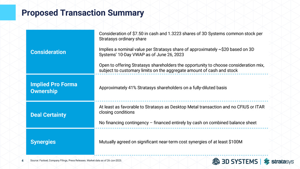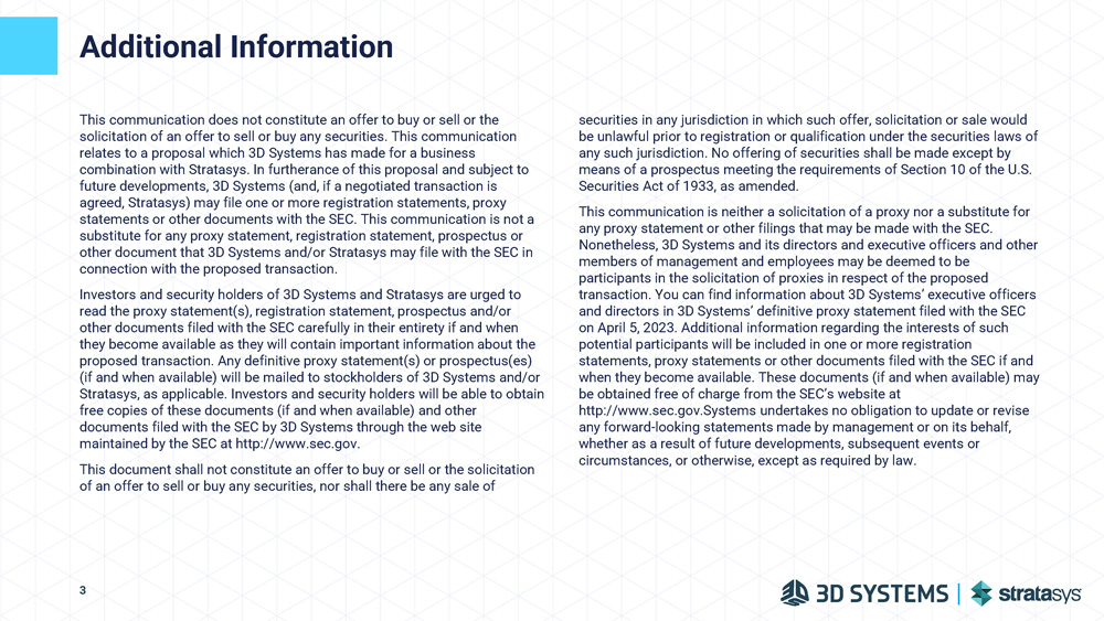 Additional Information This communication does not constitute an offer to buy or sell or the solicitation of an offer to sell or buy any securities. This communication relates to a proposal which 3D Systems has made for a business combination with Stratasys. In furtherance of this proposal and subject to future developments, 3D Systems (and, if a negotiated transaction is agreed, Stratasys) may file one or more registration statements, proxy statements or other documents with the SEC. This communication is not a substitute for any proxy statement, registration statement, prospectus or other document that 3D Systems and/or Stratasys may file with the SEC in connection with the proposed transaction. Investors and security holders of 3D Systems and Stratasys are urged to read the proxy statement(s), registration statement, prospectus and/or other documents filed with the SEC carefully in their entirety if and when they become available as they will contain important information about the proposed transaction. Any definitive proxy statement(s) or prospectus(es) (if and when available) will be mailed to stockholders of 3D Systems and/or Stratasys, as applicable. Investors and security holders will be able to obtain free copies of these documents (if and when available) and other documents filed with the SEC by 3D Systems through the web site maintained by the SEC at http://www.sec.gov. This document shall not constitute an offer to buy or sell or the solicitation of an offer to sell or buy any securities, nor shall there be any sale of securities in any jurisdiction in which such offer, solicitation or sale would be unlawful prior to registration or qualification under the securities laws of any such jurisdiction. No offering of securities shall be made except by means of a prospectus meeting the requirements of Section 10 of the U.S. Securities Act of 1933, as amended. This communication is neither a solicitation of a proxy nor a substitute for any proxy statement or other filings that may be made with the SEC. Nonetheless, 3D Systems and its directors and executive officers and other members of management and employees may be deemed to be participants in the solicitation of proxies in respect of the proposed transaction. You can find information about 3D Systems’ executive officers and directors in 3D Systems’ definitive proxy statement filed with the SEC on April 5, 2023. Additional information regarding the interests of such potential participants will be included in one or more registration statements, proxy statements or other documents filed with the SEC if and when they become available. These documents (if and when available) may be obtained free of charge from the SEC’s website at http://www.sec.gov.Systems undertakes no obligation to update or revise any forward - looking statements made by management or on its behalf, whether as a result of future developments, subsequent events or circumstances, or otherwise, except as required by law. 3