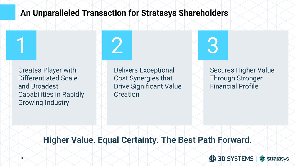 Consideration of $7.50 in cash and 1.3223 shares of 3D Systems common stock per Stratasys ordinary share Implies a nominal value per Stratasys share of approximately ~$20 based on 3D Systems’ 10 - Day VWAP as of June 26, 2023 Open to offering Stratasys shareholders the opportunity to choose consideration mix, subject to customary limits on the aggregate amount of cash and stock Consideration Approximately 41% Stratasys shareholders on a fully - diluted basis Implied Pro Forma Ownership At least as favorable to Stratasys as Desktop Metal transaction and no CFIUS or ITAR closing conditions No financing contingency – financed entirely by cash on combined balance sheet Deal Certainty Mutually agreed on significant near - term cost synergies of at least $100M Synergies Proposed Transaction Summary 4 Source: Factset, Company Filings, Press Releases. Market data as of 26 - Jun - 2023.