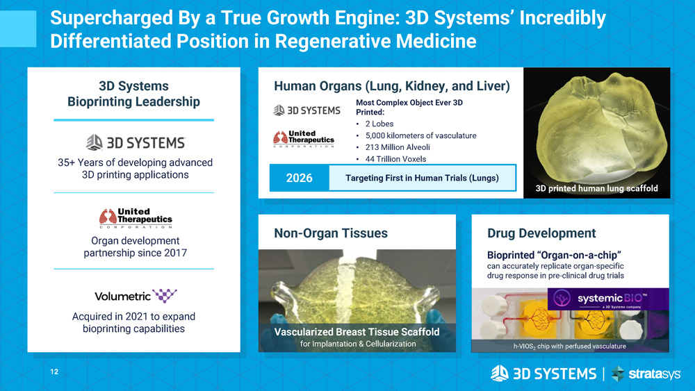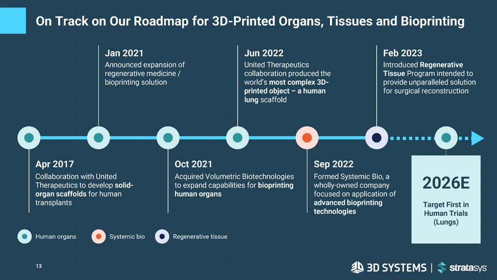 Non - Organ Tissues Supercharged By a True Growth Engine: 3D Systems’ Incredibly Differentiated Position in Regenerative Medicine 3D Systems Bioprinting Leadership 35+ Years of developing advanced 3D printing applications Organ development partnership since 2017 Acquired in 2021 to expand bioprinting capabilities 3D printed human lung scaffold Human Organs (Lung, Kidney, and Liver) Most Complex Object Ever 3D Printed: • 2 Lobes • 5,000 kilometers of vasculature • 213 Million Alveoli • 44 Trillion Voxels Targeting First in Human Trials (Lungs) 2026 Vascularized Breast Tissue Scaffold for Implantation & Cellularization Drug Development Bioprinted “Organ - on - a - chip” can accurately replicate organ - specific drug response in pre - clinical drug trials h - VIOS 2 chip with perfused vasculature 12