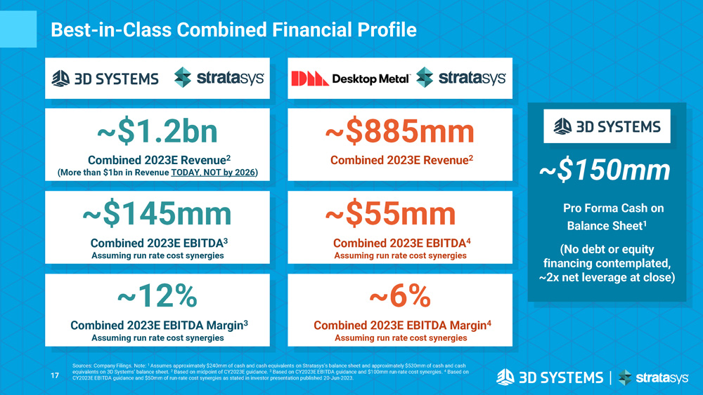 Significant Near - Term Cost Synergies Jointly Identified and Agreed Upon by 3D and Stratasys Teams SG&A Savings • Supply chain efficiencies • Eliminate overlapping functions • Effective global services support R&D Integration • Optimizing development opportunities without loss of technological expertise • Design - for - cost initiatives and complementary development opportunities • Ability to leverage combined portfolio of R&D investments • Harmonizing parallel investments in software platforms COGS Optimization • Optimized supply chain • Footprint rationalization SG&A R&D COGS $100mm+ of cost synergies Synergies Expected to be Fully Realized in 18 Months Post Close, with ~60% Realized in Year One 16 + Potentially Meaningful Revenue Upside Breakdown of Expected Synergies Synergies identified during 1 - day in - person meeting between 3D Systems and Stratasys management teams in Sep - 2022