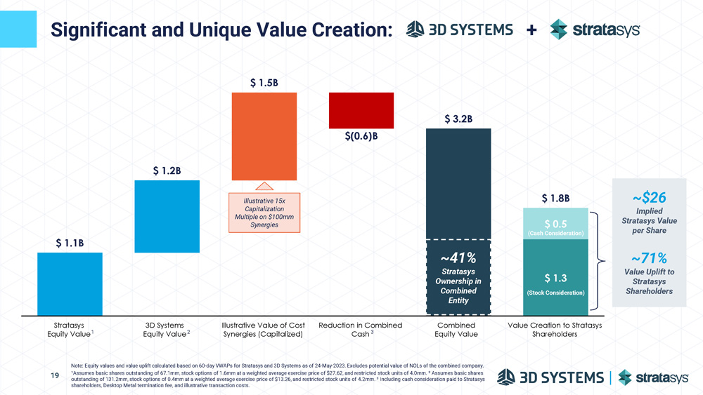 Attractive and Credible , Combined Financial Profile, Jointly Agreed with Stratasys 18 Source: Combined Management Estimates from September 2022 Meeting. Combined Company Near - Term Financial Profile Double - Digit Organic Revenue Growth ~50% Gross Profit Margin ~12% R&D Spend ~25% SG&A Spend 15%+ EBITDA Margin