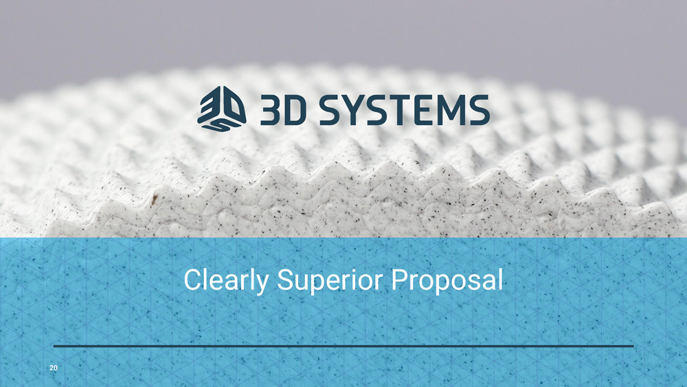 $ 1.1B $ 1.2B $ 1.5B $(0.6)B $ 3.2B $ 1.8B .50 $ 2.0 Illustrative Value of Cost Synergies (Capitalized) Combined Equity Value Value Creation to Stratasys Shareholders Significant and Unique Value Creation: + ~71% Value Uplift to Stratasys Shareholders ~$26 Implied Stratasys Value per Share Illustrative 15x Capitalization Multiple on $100mm Synergies ~41% Stratasys Ownership in Combined Entity $ 0.5 (Cash Consideration) $ 1.3 (Stock Consideration) Reduction in Combined Cash 3 Stratasys Equity Value 1 3D Systems Equity Value 2 Note: Equity values and value uplift calculated based on 60 - day VWAPs for Stratasys and 3D Systems as of 24 - May - 2023. Excludes potential value of NOLs of the combined company. ¹Assumes basic shares outstanding of 67.1mm, stock options of 1.6mm at a weighted average exercise price of $27.62, and restricted stock units of 4.0mm. ² Assumes basic shares outstanding of 131.2mm, stock options of 0.4mm at a weighted average exercise price of $13.26, and restricted stock units of 4.2mm. ³ Including cash consideration paid to Stratasys shareholders, Desktop Metal termination fee, and illustrative transaction costs. 19