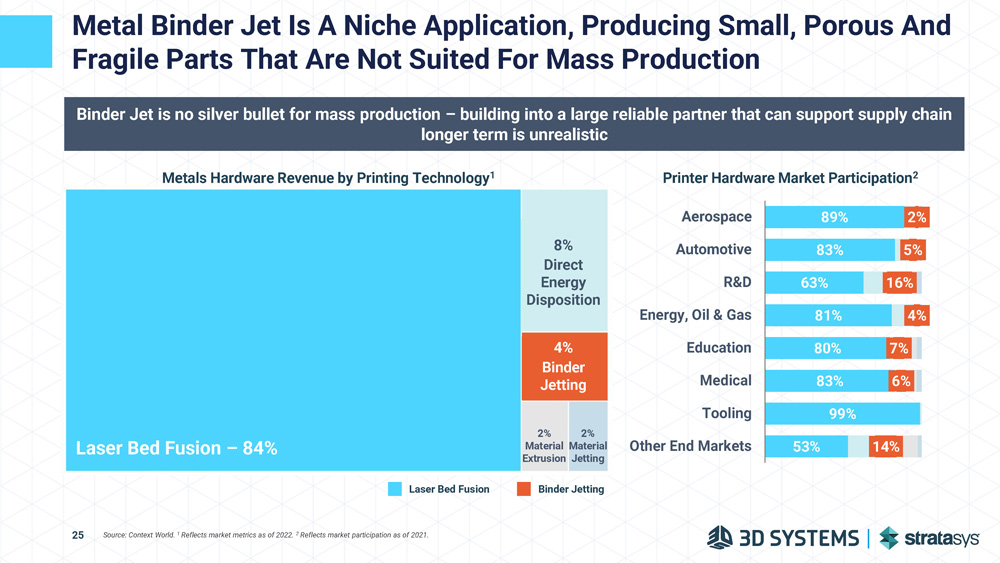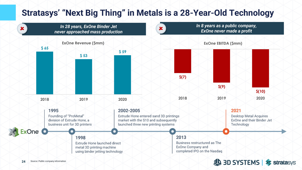 1998 Extrude Hone launched direct metal 3D printing machine using binder jetting technology Stratasys’ “Next Big Thing” in Metals is a 28 - Year - Old Technology 2021 Desktop Metal Acquires ExOne and their Binder Jet Technology 2002 - 2005 Extrude Hone entered sand 3D printings market with the S10 and subsequently launched three new printing systems 2013 Business restructured as The ExOne Company and completed IPO on the Nasdaq Source: Public company information In 8 years as a public company, ExOne never made a profit $ 65 $ 53 $ 59 2018 2019 1995 Founding of “ProMetal” division of Extrude Hone, a business unit for 3D printers 2020 ExOne Revenue ($mm) $(7) $(9) 2018 2019 $(10) 2020 ExOne EBITDA ($mm) In 28 years, ExOne Binder Jet never approached mass production 24