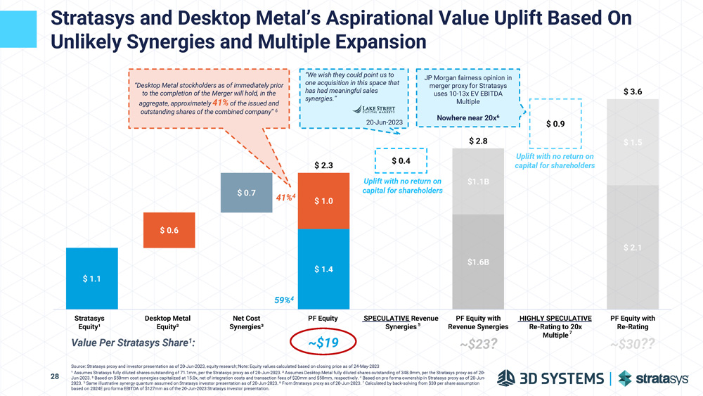 $ 1.1 $ 0.6 $ 0.7 $ 1.4 $ 1.0 $ 0.4 $1.6B $1.1B $ 0.9 $ 2.1 $ 1.5 $ 2.3 $ 2.8 $ 3.6 Stratasys Equity¹ Desktop Metal Equity² Net Cost Synergies³ PF Equity Stratasys and Desktop Metal’s Aspirational Value Uplift Based On Unlikely Synergies and Multiple Expansion Source: Stratasys proxy and investor presentation as of 20 - Jun - 2023, equity research; Note: Equity values calculated based on closing price as of 24 - May - 2023 28 ¹ Assumes Stratasys fully diluted shares outstanding of 71.1mm, per the Stratasys proxy as of 20 - Jun - 2023. ² Assumes Desktop Metal fully diluted shares outstanding of 348.0mm, per the Stratasys proxy as of 20 - Jun - 2023. ³ Based on $50mm cost synergies capitalized at 15.0x, net of integration costs and transaction fees of $20mm and $50mm, respectively. 4 Based on pro forma ownership in Stratasys proxy as of 20 - Jun - 2023. 5 Same illustrative synergy quantum assumed on Stratasys investor presentation as of 20 - Jun - 2023. 6 From Stratasys proxy as of 20 - Jun - 2023. 7 Calculated by back - solving from $30 per share assumption based on 2024E pro forma EBITDA of $127mm as of the 20 - Jun - 2023 Stratasys investor presentation. 59% 4 41% 4 JP Morgan fairness opinion in merger proxy for Stratasys uses 10 - 13x EV EBITDA Multiple Nowhere near 20x 6 “We wish they could point us to one acquisition in this space that has had meaningful sales synergies.” 20 - Jun - 2023 Value Per Stratasys Share 1 : ~$19 PF Equity with Revenue Synergies ~$23 ? PF Equity with Re - Rating ~$30 ?? SPECULATIVE Revenue Synergies 5 HIGHLY SPECULATIVE Re - Rating to 20x Multiple 7 Uplift with no return on capital for shareholders Uplift with no return on capital for shareholders “Desktop Metal stockholders as of immediately prior to the completion of the Merger will hold, in the aggregate, approximately 41% of the issued and outstanding shares of the combined company” 6