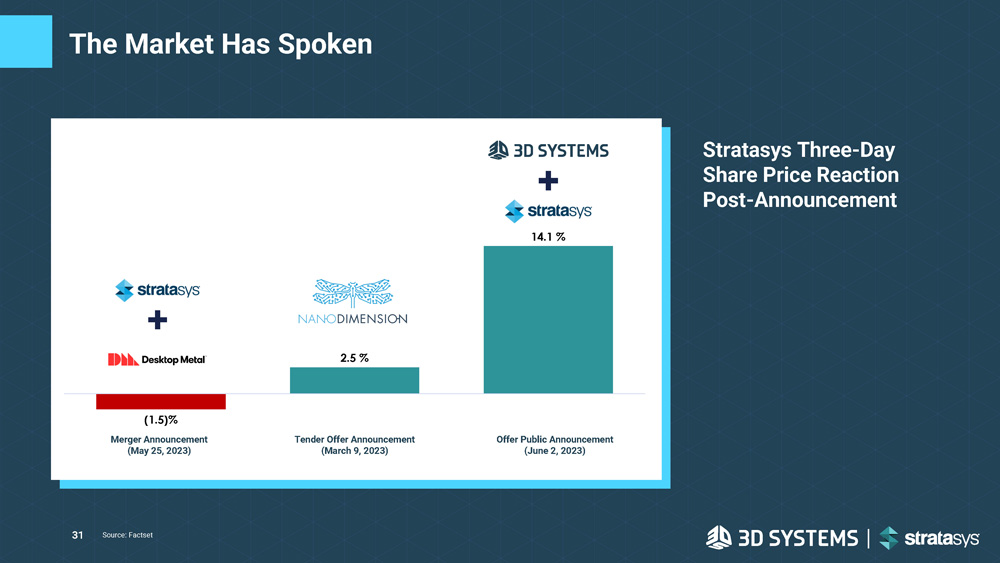 2.5 % 14.1 % SSYS + DM Merger Announcement (25 - May - 23) Nano Tender Offer Announcement (09 - Mar - 23) 3D Systems Offer Announcement (02 - Jun - 23) The Market Has Spoken Source: Factset Stratasys Three - Day Share Price Reaction Post - Announcement 31 (1.5)% Merger Announcement (May 25, 2023) Tender Offer Announcement (March 9, 2023) Offer Public Announcement (June 2, 2023)