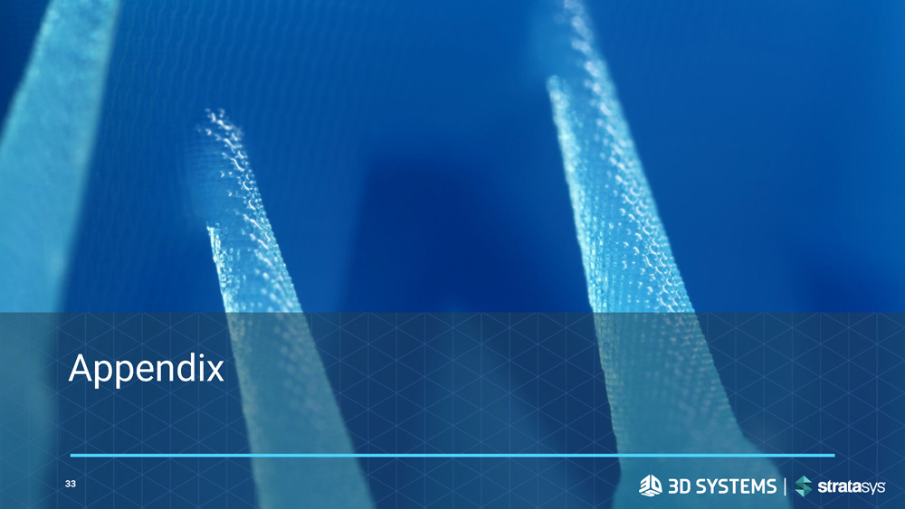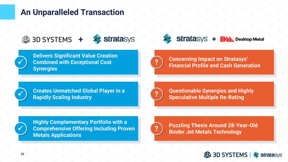 An Unparalleled Transaction 32 + Creates Unmatched Global Player in a Rapidly Scaling Industry x Highly Complementary Portfolio with a Comprehensive Offering Including Proven Metals Applications x Delivers Significant Value Creation Combined with Exceptional Cost Synergies x ? Puzzling Thesis Around 28 - Year - Old Binder Jet Metals Technology Questionable Synergies and Highly Speculative Multiple Re - Rating ? Concerning Impact on Stratasys’ Financial Profile and Cash Generation ?