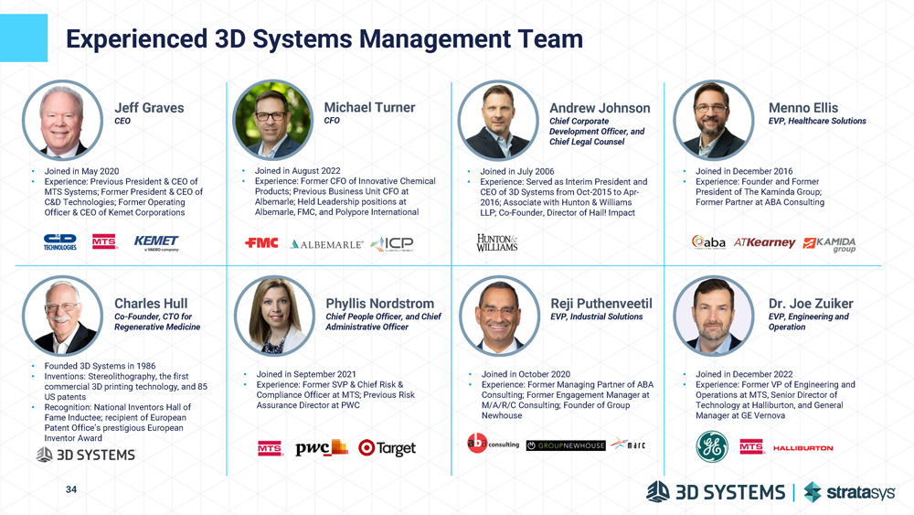 Experienced 3D Systems Management Team Jeff Graves CEO • Joined in May 2020 • Experience: Previous President & CEO of MTS Systems; Former President & CEO of C&D Technologies; Former Operating Officer & CEO of Kemet Corporations Michael Turner CFO • Joined in August 2022 • Experience: Former CFO of Innovative Chemical Products; Previous Business Unit CFO at Albemarle; Held Leadership positions at Albemarle, FMC, and Polypore International Menno Ellis EVP, Healthcare Solutions • Joined in December 2016 • Experience: Founder and Former President of The Kaminda Group; Former Partner at ABA Consulting Charles Hull Co - Founder, CTO for Regenerative Medicine • Founded 3D Systems in 1986 • Inventions: Stereolithography, the first commercial 3D printing technology, and 85 US patents • Recognition: National Inventors Hall of Fame Inductee; recipient of European Patent Office’s prestigious European Inventor Award Andrew Johnson Chief Corporate Development Officer, and Chief Legal Counsel • Joined in July 2006 • Experience: Served as Interim President and CEO of 3D Systems from Oct - 2015 to Apr - 2016; Associate with Hunton & Williams LLP; Co - Founder, Director of Hail! Impact Phyllis Nordstrom Chief People Officer, and Chief Administrative Officer • Joined in September 2021 • Experience: Former SVP & Chief Risk & Compliance Officer at MTS; Previous Risk Assurance Director at PWC Reji Puthenveetil EVP, Industrial Solutions • Joined in October 2020 • Experience: Former Managing Partner of ABA Consulting; Former Engagement Manager at M/A/R/C Consulting; Founder of Group Newhouse Dr. Joe Zuiker EVP, Engineering and Operation • Joined in December 2022 • Experience: Former VP of Engineering and Operations at MTS, Senior Director of Technology at Halliburton, and General Manager at GE Vernova 34