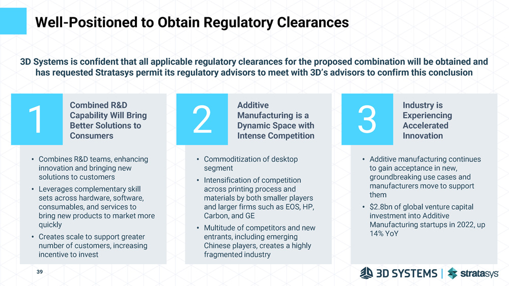 Well - Positioned to Obtain Regulatory Clearances • Commoditization of desktop segment • Intensification of competition across printing process and materials by both smaller players and larger firms such as EOS, HP, Carbon, and GE • Multitude of competitors and new entrants, including emerging Chinese players, creates a highly fragmented industry 2 • Additive manufacturing continues to gain acceptance in new, groundbreaking use cases and manufacturers move to support them • $2.8bn of global venture capital investment into Additive Manufacturing startups in 2022, up 14% YoY 3 • Combines R&D teams, enhancing innovation and bringing new solutions to customers • Leverages complementary skill sets across hardware, software, consumables, and services to bring new products to market more quickly • Creates scale to support greater number of customers, increasing incentive to invest 1 3D Systems is confident that all applicable regulatory clearances for the proposed combination will be obtained and has requested Stratasys permit its regulatory advisors to meet with 3D’s advisors to confirm this conclusion Combined R&D Capability Will Bring Better Solutions to Consumers Additive Manufacturing is a Dynamic Space with Intense Competition Industry is Experiencing Accelerated Innovation 39