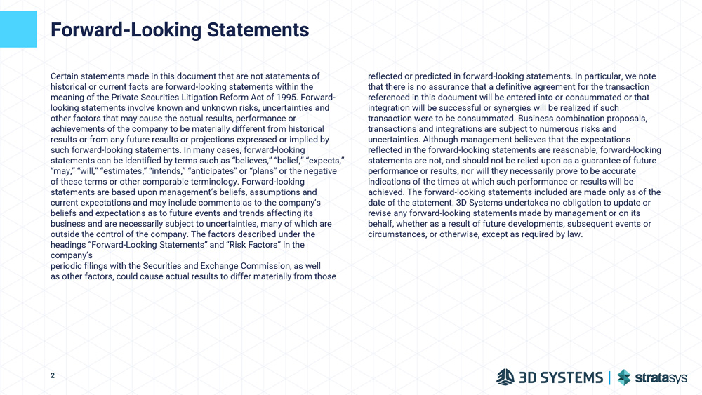 Forward - Looking Statements Certain statements made in this document that are not statements of historical or current facts are forward - looking statements within the meaning of the Private Securities Litigation Reform Act of 1995. Forward - looking statements involve known and unknown risks, uncertainties and other factors that may cause the actual results, performance or achievements of the company to be materially different from historical results or from any future results or projections expressed or implied by such forward - looking statements. In many cases, forward - looking statements can be identified by terms such as “believes,” “belief,” “expects,” “may,” “will,” “estimates,” “intends,” “anticipates” or “plans” or the negative of these terms or other comparable terminology. Forward - looking statements are based upon management’s beliefs, assumptions and current expectations and may include comments as to the company’s beliefs and expectations as to future events and trends affecting its business and are necessarily subject to uncertainties, many of which are outside the control of the company. The factors described under the headings “Forward - Looking Statements” and “Risk Factors” in the company’s periodic filings with the Securities and Exchange Commission, as well as other factors, could cause actual results to differ materially from those reflected or predicted in forward - looking statements. In particular, we note that there is no assurance that a definitive agreement for the transaction referenced in this document will be entered into or consummated or that integration will be successful or synergies will be realized if such transaction were to be consummated. Business combination proposals, transactions and integrations are subject to numerous risks and uncertainties. Although management believes that the expectations reflected in the forward - looking statements are reasonable, forward - looking statements are not, and should not be relied upon as a guarantee of future performance or results, nor will they necessarily prove to be accurate indications of the times at which such performance or results will be achieved. The forward - looking statements included are made only as of the date of the statement. 3D Systems undertakes no obligation to update or revise any forward - looking statements made by management or on its behalf, whether as a result of future developments, subsequent events or circumstances, or otherwise, except as required by law. 2