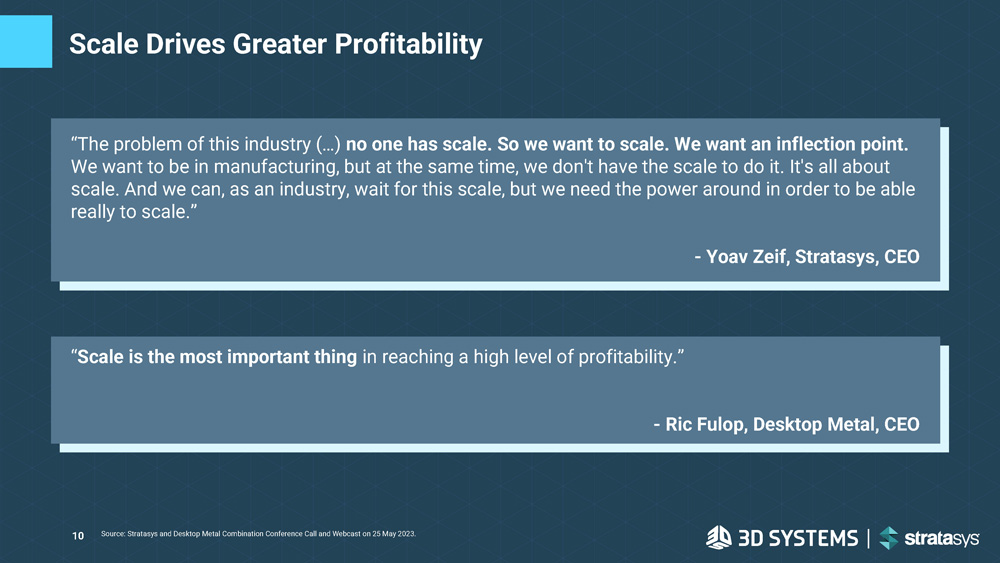 10 Scale Drives Greater Profitability “The problem of this industry (…) no one has scale. So we want to scale. We want an inflection point. We want to be in manufacturing, but at the same time, we don't have the scale to do it. It's all about scale. And we can, as an industry, wait for this scale, but we need the power around in order to be able really to scale.” - Yoav Zeif, Stratasys, CEO Source: Stratasys and Desktop Metal Combination Conference Call and Webcast on 25 May 2023. “ Scale is the most important thing in reaching a high level of profitability.” - Ric Fulop, Desktop Metal, CEO