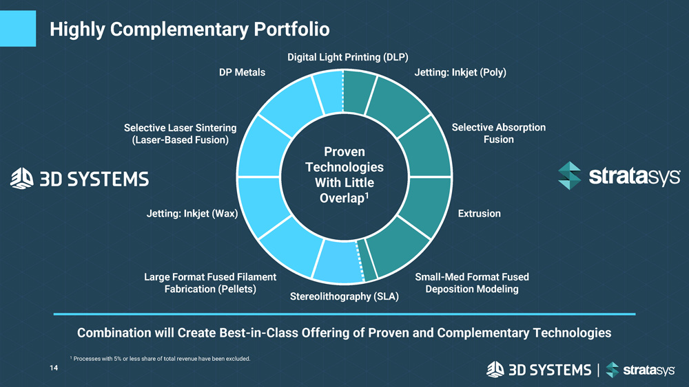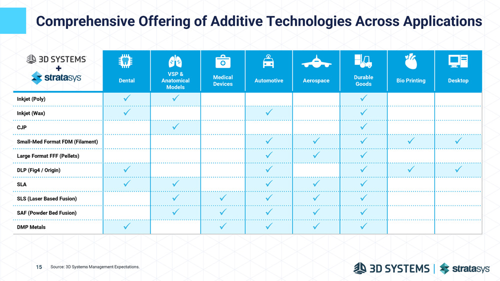 Highly Complementary Portfolio Selective Laser Sintering (Laser - Based Fusion) Large Format Fused Filament Fabrication (Pellets) Jetting: Inkjet (Wax) Jetting: Inkjet (Poly) Selective Absorption Fusion Small - Med Format Fused Deposition Modeling Extrusion Proven Technologies With Little Overlap 1 Combination will Create Best - in - Class Offering of Proven and Complementary Technologies Stereolithography (SLA) Digital Light Printing (DLP) DP Metals SSYS 1 Processes with 5% or less share of total revenue have been excluded. 14