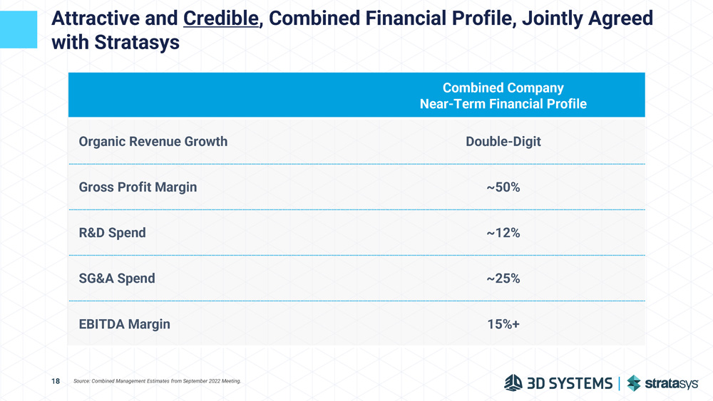 Best - in - Class Combined Financial Profile Sources: Company Filings. Note: 1 Assumes approximately $240mm of cash and cash equivalents on Stratasys’s balance sheet and approximately $530mm of cash and cash equivalents on 3D Systems’ balance sheet. 2 Based on midpoint of CY2023E guidance. 3 Based on CY2023E EBITDA guidance and $100mm run - rate cost synergies. 4 Based on CY2023E EBITDA guidance and $50mm of run - rate cost synergies as stated in investor presentation published 20 - Jun - 2023. 17 ~$1.2bn Combined 2023E Revenue 2 (More than $1bn in Revenue TODAY , NOT by 2026 ) ~$145mm Combined 2023E EBITDA 3 Assuming run rate cost synergies ~12% Combined 2023E EBITDA Margin 3 Assuming run rate cost synergies ~$885mm Combined 2023E Revenue 2 ~$55mm Combined 2023E EBITDA 4 Assuming run rate cost synergies ~6% Combined 2023E EBITDA Margin 4 Assuming run rate cost synergies ~$150mm Pro Forma Cash on Balance Sheet 1 (No debt or equity financing contemplated, ~2x net leverage at close)