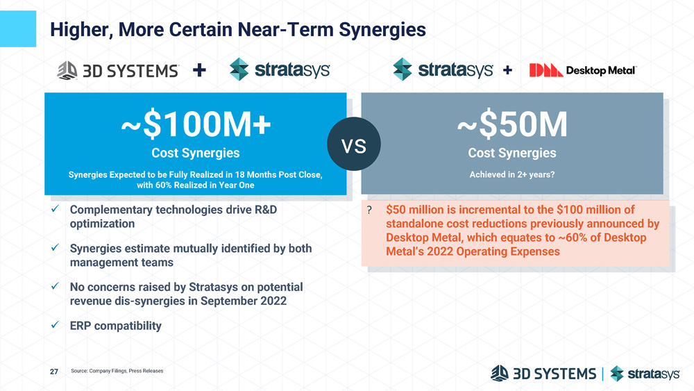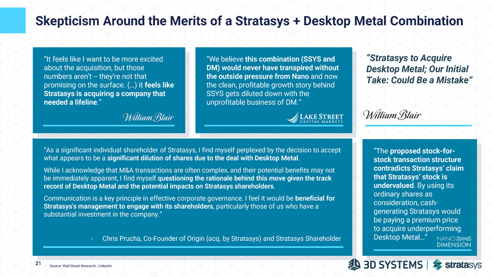 “We believe this combination (SSYS and DM) would never have transpired without the outside pressure from Nano and now the clean, profitable growth story behind SSYS gets diluted down with the unprofitable business of DM.” “The proposed stock - for - stock transaction structure contradicts Stratasys’ claim that Stratasys’ stock is undervalued . By using its ordinary shares as consideration, cash - generating Stratasys would be paying a premium price to acquire underperforming Desktop Metal…” “It feels like I want to be more excited about the acquisition, but those numbers aren't - - they're not that promising on the surface. (…) it feels like Stratasys is acquiring a company that needed a lifeline .” “As a significant individual shareholder of Stratasys, I find myself perplexed by the decision to accept what appears to be a significant dilution of shares due to the deal with Desktop Metal . While I acknowledge that M&A transactions are often complex, and their potential benefits may not be immediately apparent, I find myself questioning the rationale behind this move given the track record of Desktop Metal and the potential impacts on Stratasys shareholders . Communication is a key principle in effective corporate governance. I feel it would be beneficial for Stratasys's management to engage with its shareholders , particularly those of us who have a substantial investment in the company.” - Chris Prucha, Co - Founder of Origin (acq. by Stratasys) and Stratasys Shareholder “Stratasys to Acquire Desktop Metal; Our Initial Take: Could Be a Mistake” Skepticism Around the Merits of a Stratasys + Desktop Metal Combination 21 Source: Wall Street Research ; LinkedIn