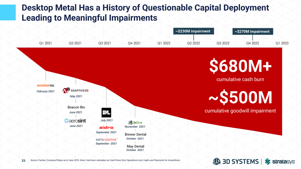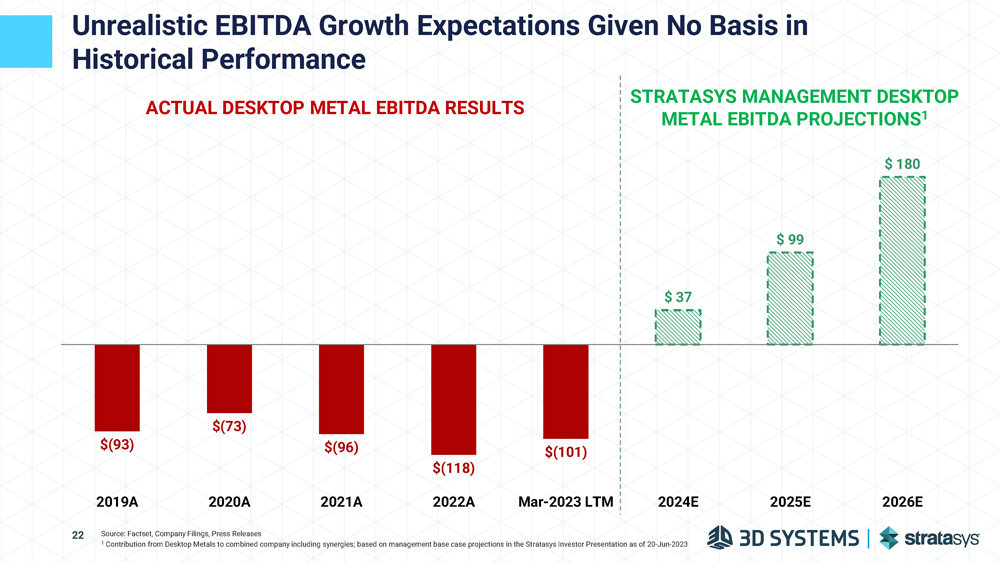 $(93) $(73) $(96) $(118) $(101) $ 99 $ 37 $ 180 0) $ 200 2025E 2026E Unrealistic EBITDA Growth Expectations Given No Basis in Historical Performance ACTUAL DESKTOP METAL EBITDA RESULTS 2019A 2020A 2021A 2022A Mar - 2023 LTM 2024E Source: Factset, Company Filings, Press Releases 1 Contribution from Desktop Metals to combined company including synergies; based on management base case projections in the Stratasys Investor Presentation as of 20 - Jun - 2023 STRATASYS MANAGEMENT DESKTOP METAL EBITDA PROJECTIONS 1 22