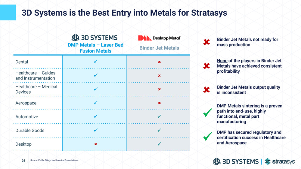 3D Systems is the Best Entry into Metals for Stratasys Binder Jet Metals DMP Metals – Laser Bed Fusion Metals x Dental x Healthcare – Guides and Instrumentation x Healthcare – Medical Devices x Aerospace x x Automotive x x Durable Goods x Desktop Binder Jet Metals not ready for mass production None of the players in Binder Jet Metals have achieved consistent profitability Binder Jet Metals output quality is inconsistent Source: Public Filings and Investor Presentations. 26 DMP Metals sintering is a proven path into end - use, highly functional, metal part manufacturing DMP has secured regulatory and certification success in Healthcare and Aerospace x x