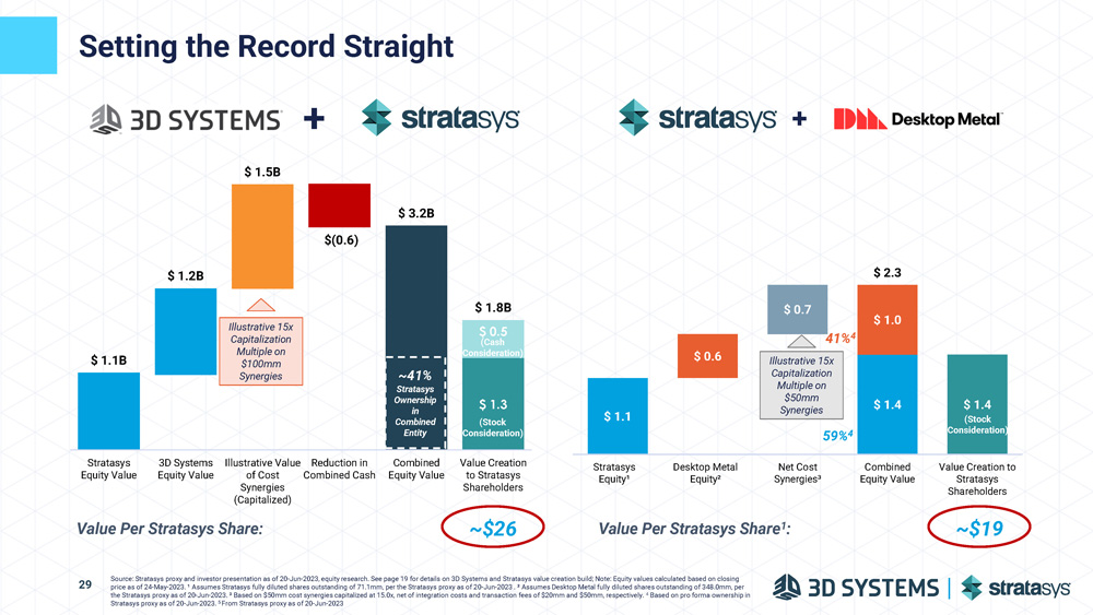 $ 1.1 $ 0.6 $ 0.7 $ 1.4 $ 1.0 $ 0.4 $1.6B $1.1B $ 0.9 $ 2.1 $ 1.5 $ 2.3 $ 2.8 $ 3.6 Stratasys Equity¹ Desktop Metal Equity² Net Cost Synergies³ PF Equity Stratasys and Desktop Metal’s Aspirational Value Uplift Based On Unlikely Synergies and Multiple Expansion Source: Stratasys proxy and investor presentation as of 20 - Jun - 2023, equity research; Note: Equity values calculated based on closing price as of 24 - May - 2023 28 ¹ Assumes Stratasys fully diluted shares outstanding of 71.1mm, per the Stratasys proxy as of 20 - Jun - 2023. ² Assumes Desktop Metal fully diluted shares outstanding of 348.0mm, per the Stratasys proxy as of 20 - Jun - 2023. ³ Based on $50mm cost synergies capitalized at 15.0x, net of integration costs and transaction fees of $20mm and $50mm, respectively. 4 Based on pro forma ownership in Stratasys proxy as of 20 - Jun - 2023. 5 Same illustrative synergy quantum assumed on Stratasys investor presentation as of 20 - Jun - 2023. 6 From Stratasys proxy as of 20 - Jun - 2023. 7 Calculated by back - solving from $30 per share assumption based on 2024E pro forma EBITDA of $127mm as of the 20 - Jun - 2023 Stratasys investor presentation. 59% 4 41% 4 JP Morgan fairness opinion in merger proxy for Stratasys uses 10 - 13x EV EBITDA Multiple Nowhere near 20x 6 “We wish they could point us to one acquisition in this space that has had meaningful sales synergies.” 20 - Jun - 2023 Value Per Stratasys Share 1 : ~$19 PF Equity with Revenue Synergies ~$23 ? PF Equity with Re - Rating ~$30 ?? SPECULATIVE Revenue Synergies 5 HIGHLY SPECULATIVE Re - Rating to 20x Multiple 7 Uplift with no return on capital for shareholders Uplift with no return on capital for shareholders “Desktop Metal stockholders as of immediately prior to the completion of the Merger will hold, in the aggregate, approximately 41% of the issued and outstanding shares of the combined company” 6
