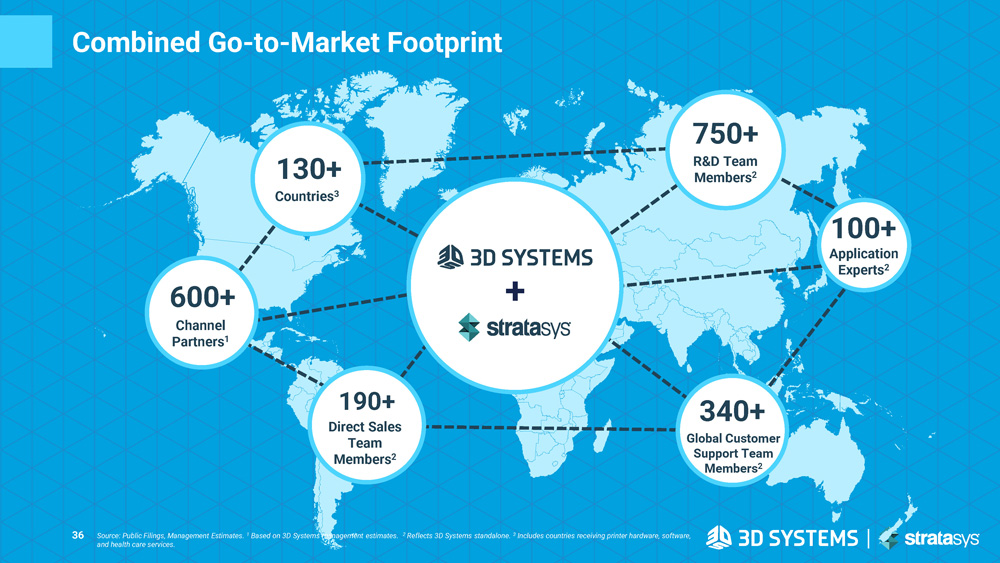 Combined Go - to - Market Footprint 130+ Countries 3 600+ Channel Partners 1 190+ Direct Sales Team Members 2 340+ Global Customer Support Team Members 2 750+ R&D Team Members 2 100+ Application Experts 2 + 36 Source: Public Filings, Management Estimates. 1 Based on 3D Systems management estimates. 2 Reflects 3D Systems standalone. 3 Includes countries receiving printer hardware, software, and health care services.