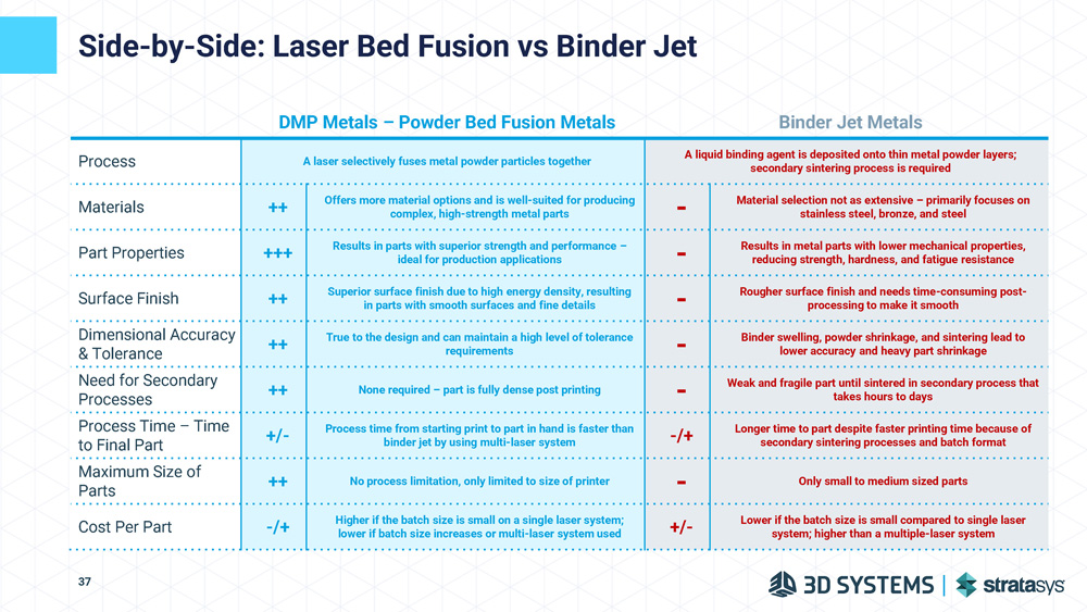 Side - by - Side: Laser Bed Fusion vs Binder Jet 37 Binder Jet Metals DMP Metals – Powder Bed Fusion Metals A liquid binding agent is deposited onto thin metal powder layers; secondary sintering process is required A laser selectively fuses metal powder particles together Process Material selection not as extensive – primarily focuses on stainless steel, bronze, and steel - Offers more material options and is well - suited for producing complex, high - strength metal parts ++ Materials Results in metal parts with lower mechanical properties, reducing strength, hardness, and fatigue resistance - Results in parts with superior strength and performance – ideal for production applications +++ Part Properties Rougher surface finish and needs time - consuming post - processing to make it smooth - Superior surface finish due to high energy density, resulting in parts with smooth surfaces and fine details ++ Surface Finish Binder swelling, powder shrinkage, and sintering lead to lower accuracy and heavy part shrinkage - True to the design and can maintain a high level of tolerance requirements ++ Dimensional Accuracy & Tolerance Weak and fragile part until sintered in secondary process that takes hours to days - None required – part is fully dense post printing ++ Need for Secondary Processes Longer time to part despite faster printing time because of secondary sintering processes and batch format - /+ Process time from starting print to part in hand is faster than binder jet by using multi - laser system +/ - Process Time – Time to Final Part Only small to medium sized parts - No process limitation, only limited to size of printer ++ Maximum Size of Parts Lower if the batch size is small compared to single laser system; higher than a multiple - laser system +/ - Higher if the batch size is small on a single laser system; lower if batch size increases or multi - laser system used - /+ Cost Per Part