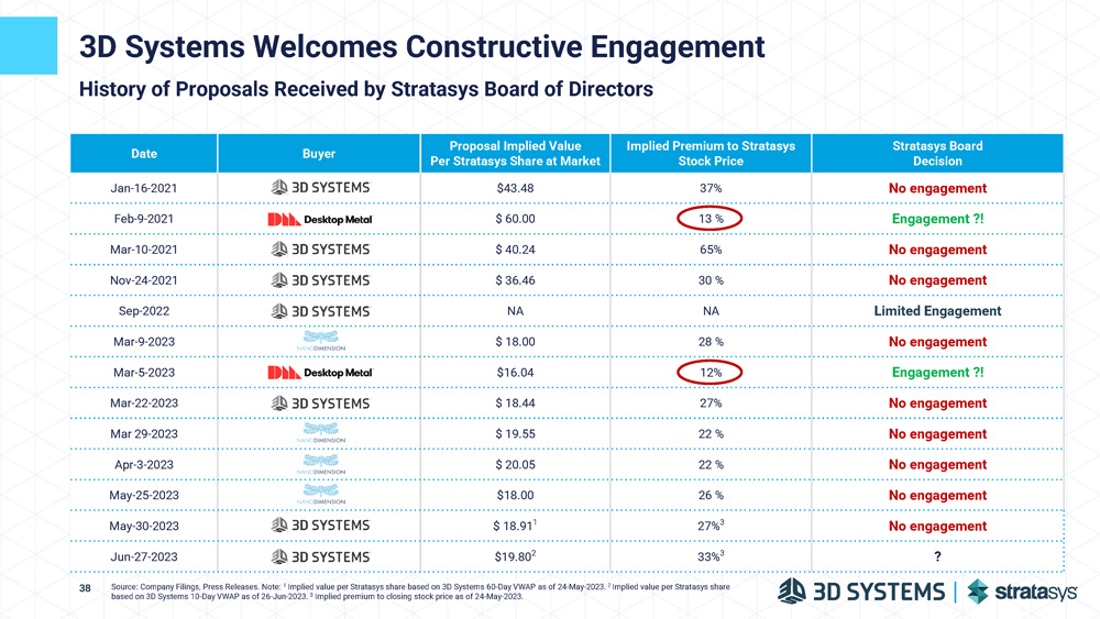 3D Systems Welcomes Constructive Engagement Stratasys Board Decision Implied Premium to Stratasys Stock Price Proposal Implied Value Per Stratasys Share at Market Buyer Date No engagement 37% $43.48 Jan - 16 - 2021 Engagement ?! 13 % $ 60.00 Feb - 9 - 2021 No engagement 65% $ 40.24 Mar - 10 - 2021 No engagement 30 % $ 36.46 Nov - 24 - 2021 Limited Engagement NA NA Sep - 2022 No engagement 28 % $ 18.00 Mar - 9 - 2023 Engagement ?! 12% $16.04 Mar - 5 - 2023 No engagement 27% $ 18.44 Mar - 22 - 2023 No engagement 22 % $ 19.55 Mar 29 - 2023 No engagement 22 % $ 20.05 Apr - 3 - 2023 No engagement 26 % $18.00 May - 25 - 2023 No engagement 27% 3 $ 18.91 1 May - 30 - 2023 ? 33% 3 $19.80 2 Jun - 27 - 2023 History of Proposals Received by Stratasys Board of Directors Source: Company Filings, Press Releases. Note: 1 Implied value per Stratasys share based on 3D Systems 60 - Day VWAP as of 24 - May - 2023. 2 Implied value per Stratasys share based on 3D Systems 10 - Day VWAP as of 26 - Jun - 2023. 3 Implied premium to closing stock price as of 24 - May - 2023. 38