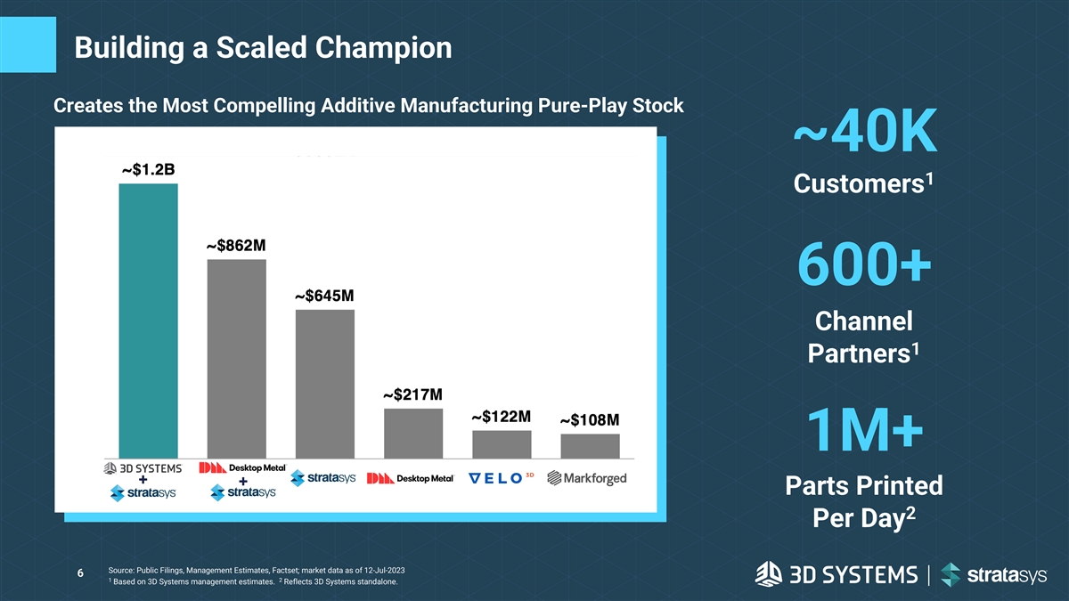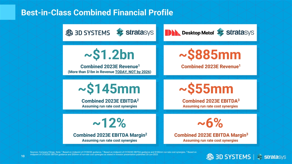 | 1 | Assumes $1,500mm in incremental equity value from $100mm of cost synergies capitalized at an illustrative 15x multiple, approximately 44% combined company ownership to Stratasys shareholders, a total cash payment by 3D Systems to Stratasys shareholders of approximately $540mm, and additional illustrative transaction cost assumptions, including payment of the termination fee to Desktop Metal. Equity values and value uplift calculated based on 60-day VWAPs for Stratasys and 3D Systems as of May 24, 2023. |