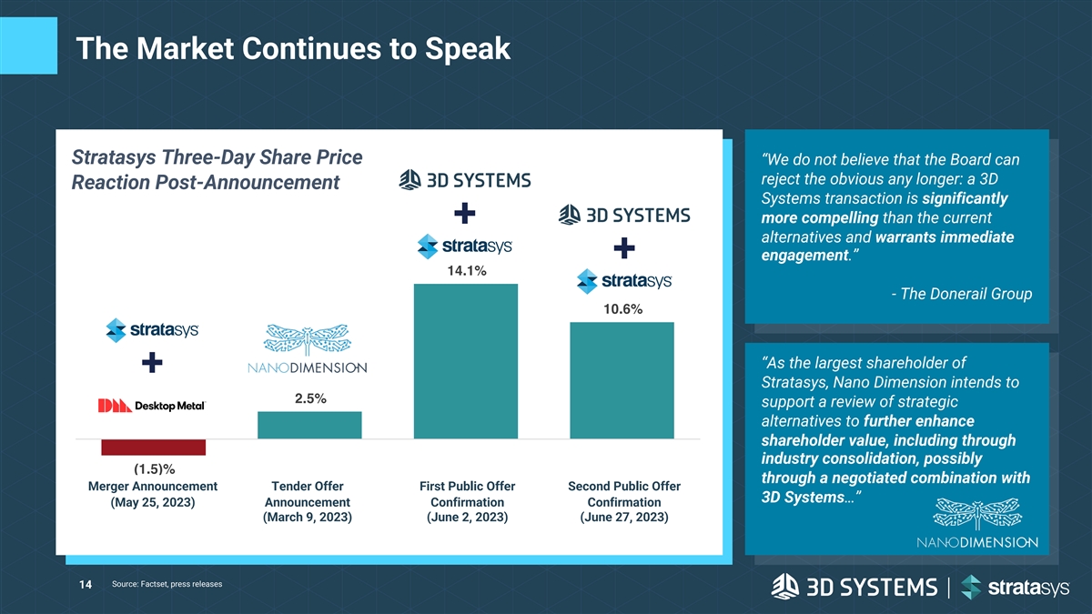 President and CEO Dr. Jeffrey Graves stated, We have continued to pursue a friendly combination with Stratasys with the objective of maximizing value for the shareholders of both companies. Multiple large Stratasys shareholders have reached out to inform us that they believe a combination of 3D Systems and Stratasys is the right path forward. This feedback affirms our conviction that we are doing right by shareholders today by offering exceptional value, certainty and transparency, and agreeing to pick up the termination fee that will be payable to Desktop Metal.