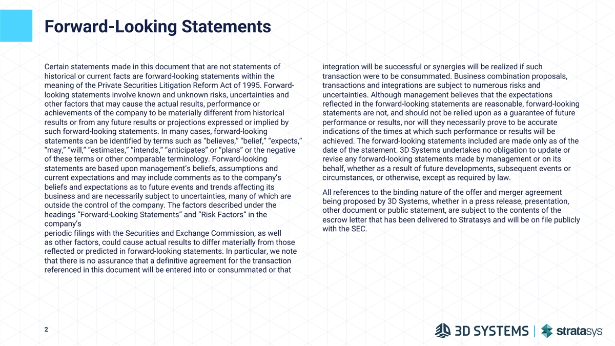 Certain statements made in this document that are not statements of historical or current facts are forward-looking statements within the meaning of the Private Securities Litigation Reform Act of 1995. Forward-looking statements involve known and unknown risks, uncertainties and other factors that may cause the actual results, performance or achievements of the company to be materially different from historical results or from any future results or projections expressed or implied by such forward-looking statements. In many cases, forward-looking statements can be identified by terms such as believes, belief, expects, may, will, estimates, intends, anticipates or plans or the negative of these terms or other comparable terminology. Forward-looking statements are based upon managements beliefs, assumptions and current expectations and may include comments as to the Companys beliefs and expectations as to future events and trends affecting its business and are necessarily subject to uncertainties, many of which are outside the control of the Company. The factors described under the headings Forward-Looking Statements and Risk Factors in the Companys periodic filings with the Securities and Exchange Commission (the SEC), as well as other factors, could cause actual results to differ materially from those reflected or predicted in forward-looking statements. In particular, we note that there is no assurance that a definitive agreement for the transaction referenced in this report will be entered into or consummated or that integration will be successful or synergies will be realized if such transaction were to be consummated. Business combination proposals, transactions and integrations are subject to numerous risks and uncertainties. Although management believes that the expectations reflected in the forward-looking statements are reasonable, forward-looking statements are not, and should not be relied upon as a guarantee of future performance or results, nor will they necessarily prove to be accurate indications of the times at which such performance or results will be achieved. The forward-looking statements included are made only as of the date of the statement. 3D Systems undertakes no obligation to update or revise any forward-looking statements made by management or on its behalf, whether as a result of future developments, subsequent events or circumstances, or otherwise, except as required by law.