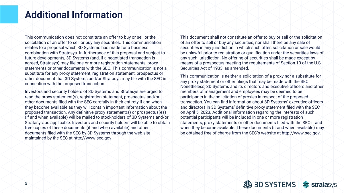 INVESTORS AND SECURITY HOLDERS OF 3D SYSTEMS AND STRATASYS ARE URGED TO READ THE PROXY STATEMENT(S), REGISTRATION STATEMENT, PROSPECTUS AND/OR OTHER DOCUMENTS FILED WITH THE SEC CAREFULLY IN THEIR ENTIRETY IF AND WHEN THEY BECOME AVAILABLE AS THEY WILL CONTAIN IMPORTANT INFORMATION ABOUT THE PROPOSED TRANSACTION. ANY DEFINITIVE PROXY STATEMENT(S) OR PROSPECTUS(ES) (IF AND WHEN AVAILABLE) WILL BE MAILED TO STOCKHOLDERS OF 3D SYSTEMS AND/OR STRATASYS, AS APPLICABLE. Investors and security holders will be able to obtain free copies of these documents (if and when available) and other documents filed with the SEC by 3D Systems through the web site maintained by the SEC at http://www.sec.gov.