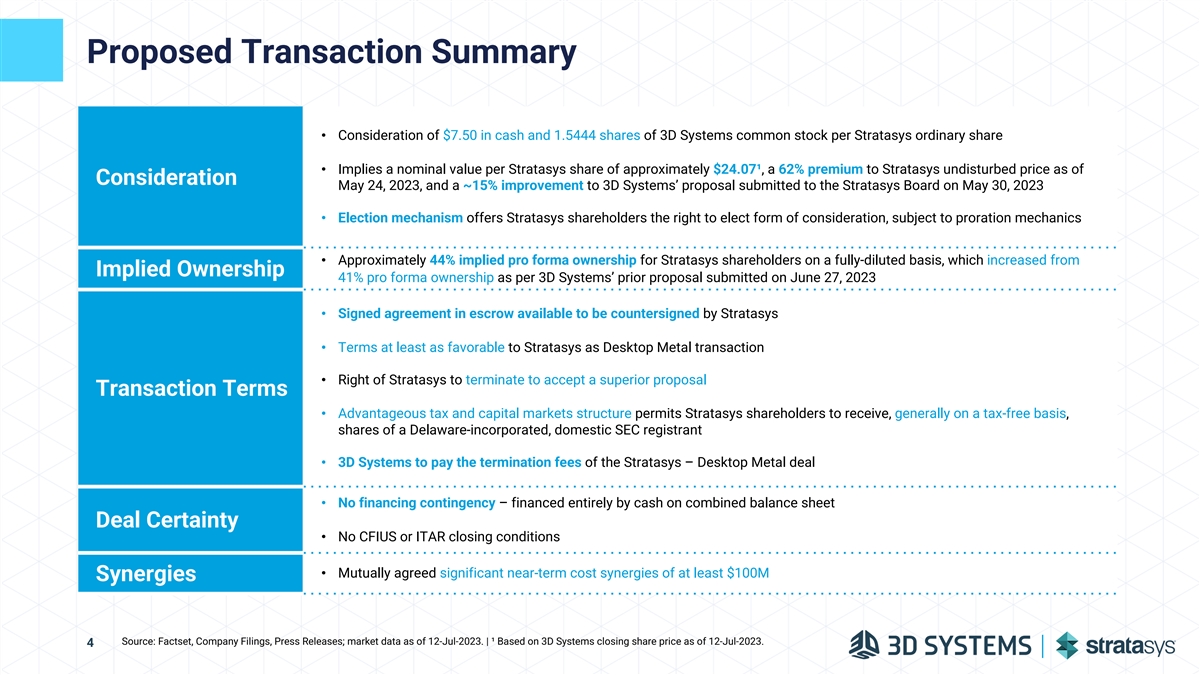 | | Implied value per Stratasys share of $24.07, based on 3D Systems July 12, 2023 closing share price, representing a 62% premium to the closing price per Stratasys share on May 24, 2023, the last trading day prior to the announcement of the proposed transaction by Stratasys with Desktop Metal. |
