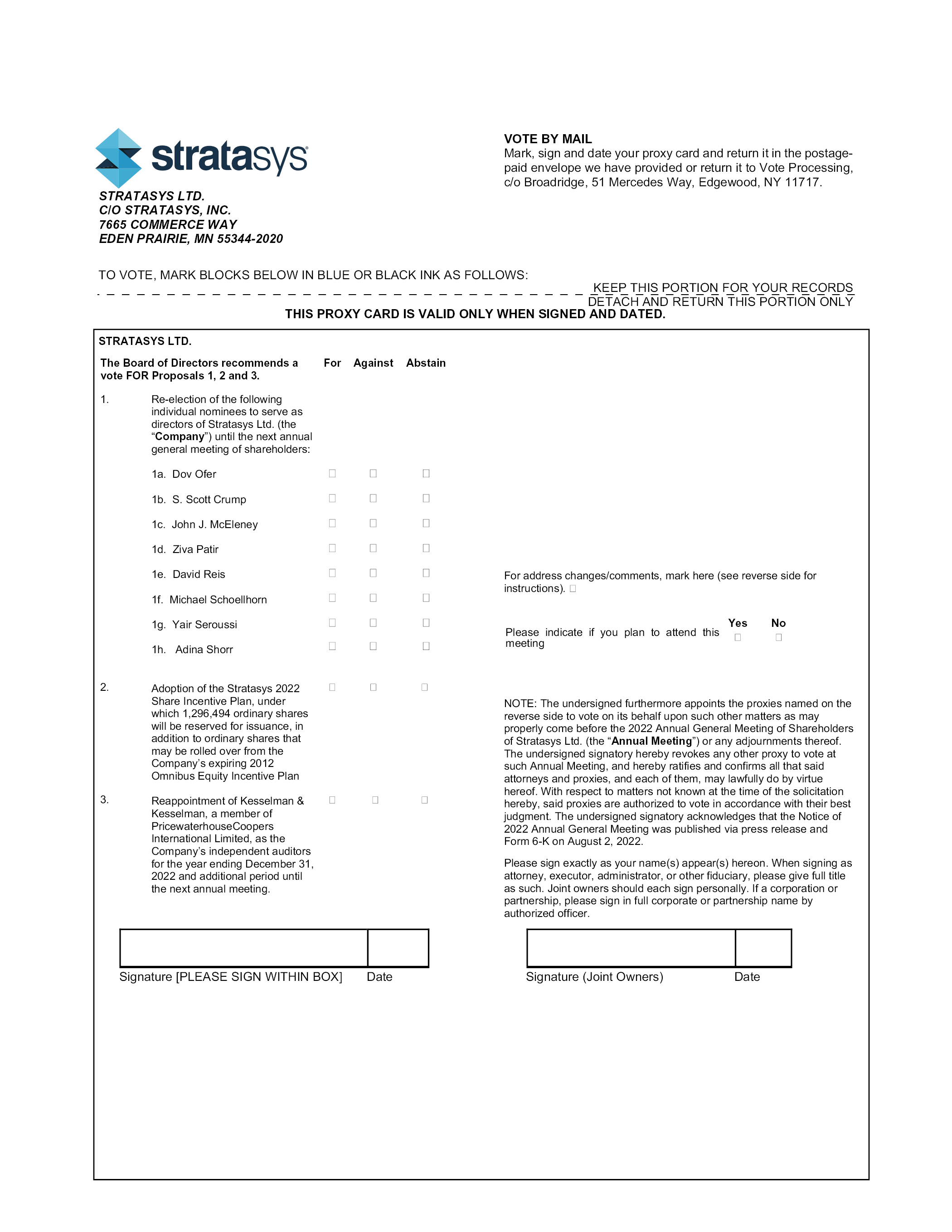STRATASYS LTD. C/O STRATASYS, INC. 7665 COMMERCE WAY EDEN PRAIRIE, MN 55344-2020 VOTE BY MAIL Mark, sign and date your proxy card and return it in the postage-paid envelope we have provided or return it to Vote Processing, c/o Broadridge, 51 Mercedes Way, Edgewood, NY 11717. TO VOTE, MARK BLOCKS BELOW IN BLUE OR BLACK INK AS FOLLOWS: KEEP THIS PORTION FOR YOUR RECORDS DETACH AND RETURN THIS PORTION ONLY THIS PROXY CARD IS VALID ONLY WHEN SIGNED AND DATED. STRATASYS LTD. The Board of Directors recommends a vote FOR Proposals 1, 2 and 3. For Against Abstain 1. Re-election of the following individual nominees to serve as directors of Stratasys Ltd. (the “Company”) until the next annual general meeting of shareholders: 1a. Dov Ofer 1b. S. Scott Crump 1c. John J. McEleney 1d. Ziva Patir 1e. David Reis 1f. Michael Schoellhorn 1g. Yair Seroussi 1h. Adina Shorr 2. Adoption of the Stratasys 2022 Share Incentive Plan, under which 1,296,494 ordinary shares will be reserved for issuance, in addition to ordinary shares that may be rolled over from the Company’s expiring 2012 Omnibus Equity Incentive Plan 3. Reappointment of Kesselman & Kesselman, a member of PricewaterhouseCoopers International Limited, as the Company’s independent auditors for the year ending December 31, 2022 and additional period until the next annual meeting. For address changes/comments, mark here (see reverse side for instructions). Please indicate if you plan to attend this meeting Yes No NOTE: The undersigned furthermore appoints the proxies named on the reverse side to vote on its behalf upon such other matters as may properly come before the 2022 Annual General Meeting of Shareholders of Stratasys Ltd. (the “Annual Meeting”) or any adjournments thereof. The undersigned signatory hereby revokes any other proxy to vote at such Annual Meeting, and hereby ratifies and confirms all that said attorneys and proxies, and each of them, may lawfully do by virtue hereof. With respect to matters not known at the time of the solicitation hereby, said proxies are authorized to vote in accordance with their best judgment. The undersigned signatory acknowledges that the Notice of 2022 Annual General Meeting was published via press release and Form 6-K on August 2, 2022. Please sign exactly as your name(s) appear(s) hereon. When signing as attorney, executor, administrator, or other fiduciary, please give full title as such. Joint owners should each sign personally. If a corporation or partnership, please sign in full corporate or partnership name by authorized officer. Signature [PLEASE SIGN WITHIN BOX] Date Signature (Joint Owners) Date