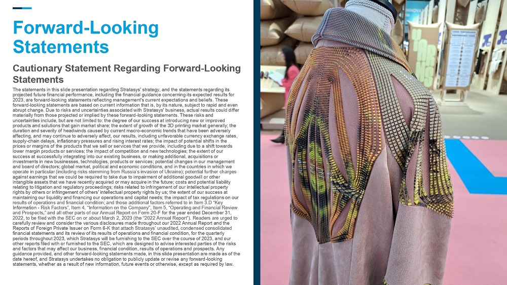 Forward - Looking Statements Cautionary Statement Regarding Forward - Looking Statements 3 3 The statements in this slide presentation regarding Stratasys' strategy, and the statements regarding its projected future financial performance, including the financial guidance concerning its expected results for 2023, are forward - looking statements reflecting management's current expectations and beliefs. These forward - looking statements are based on current information that is, by its nature, subject to rapid and even abrupt change. Due to risks and uncertainties associated with Stratasys' business, actual results could differ materially from those projected or implied by these forward - looking statements. These risks and uncertainties include, but are not limited to: the degree of our success at introducing new or improved products and solutions that gain market share; the extent of growth of the 3D printing market generally; the duration and severity of headwinds caused by current macro - economic trends that have been adversely affecting, and may continue to adversely affect, our results, including unfavorable currency exchange rates, supply - chain delays, inflationary pressures and rising interest rates; the impact of potential shifts in the prices or margins of the products that we sell or services that we provide, including due to a shift towards lower margin products or services; the impact of competition and new technologies; the extent of our success at successfully integrating into our existing business, or making additional, acquisitions or investments in new businesses, technologies, products or services; potential changes in our management and board of directors; global market, political and economic conditions, and in the countries in which we operate in particular (including risks stemming from Russia’s invasion of Ukraine); potential further charges against earnings that we could be required to take due to impairment of additional goodwill or other intangible assets that we have recently acquired or may acquire in the future; costs and potential liability relating to litigation and regulatory proceedings; risks related to infringement of our intellectual property rights by others or infringement of others' intellectual property rights by us; the extent of our success at maintaining our liquidity and financing our operations and capital needs; the impact of tax regulations on our results of operations and financial condition; and those additional factors referred to in Item 3.D “Key Information - Risk Factors”, Item 4, “Information on the Company”, Item 5, “Operating and Financial Review and Prospects,” and all other parts of our Annual Report on Form 20 - F for the year ended December 31, 2022, to be filed with the SEC on or about March 2, 2023 (the “2022 Annual Report”). Readers are urged to carefully review and consider the various disclosures made throughout our 2022 Annual Report and the Reports of Foreign Private Issuer on Form 6 - K that attach Stratasys’ unaudited, condensed consolidated financial statements and its review of its results of operations and financial condition, for the quarterly periods throughout 2023, which Stratasys will be furnishing to the SEC over the course of 2023, and our other reports filed with or furnished to the SEC, which are designed to advise interested parties of the risks and factors that may affect our business, financial condition, results of operations and prospects. Any guidance provided, and other forward - looking statements made, in this slide presentation are made as of the date hereof, and Stratasys undertakes no obligation to publicly update or revise any forward - looking statements, whether as a result of new information, future events or otherwise, except as required by law.