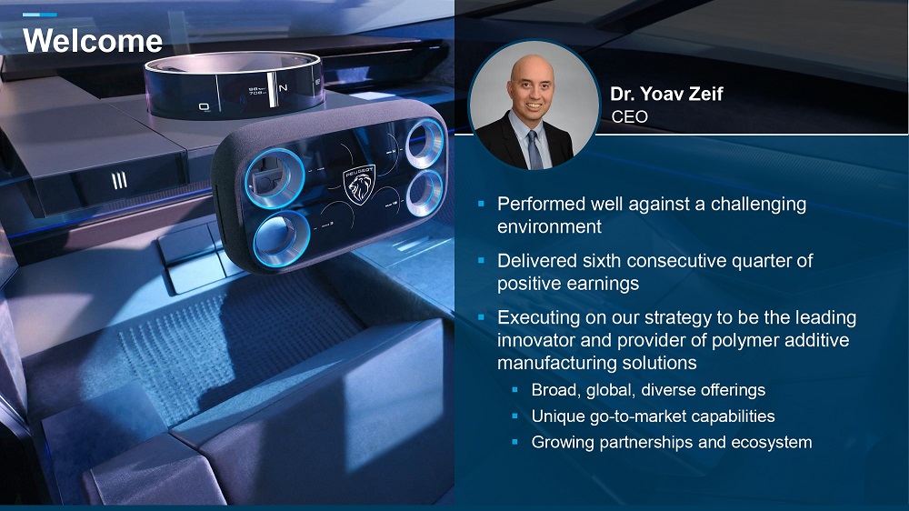 Welcome ▪ Performed well against a challenging environment ▪ Delivered sixth consecutive quarter of positive earnings ▪ Executing on our strategy to be the leading innovator and provider of polymer additive manufacturing solutions ▪ Broad, global, diverse offerings ▪ Unique go - to - market capabilities ▪ Growing partnerships and ecosystem CEO Dr. Yoav Zeif