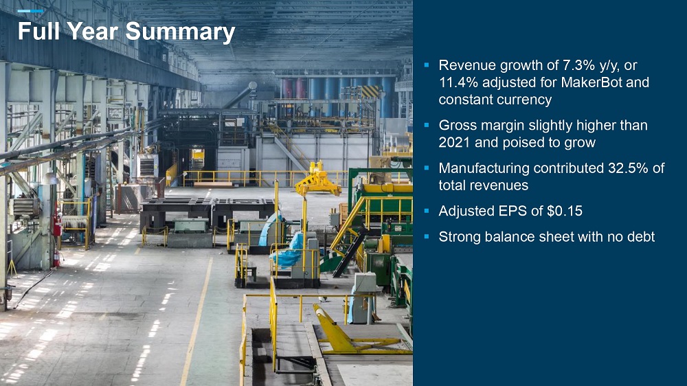 6 Full Year Summary ▪ Revenue growth of 7.3% y/y, or 11.4% adjusted for MakerBot and constant currency ▪ Gross margin slightly higher than 2021 and poised to grow ▪ Manufacturing contributed 32.5% of total revenues ▪ Adjusted EPS of $0.15 ▪ Strong balance sheet with no debt