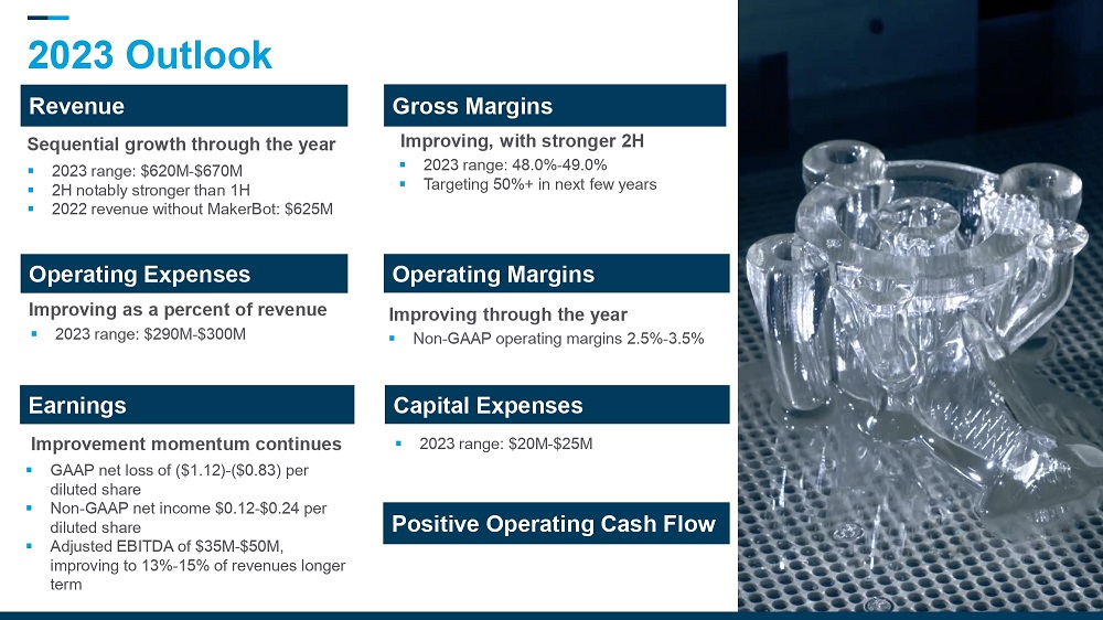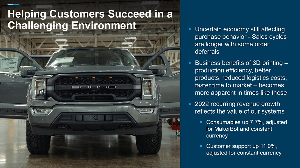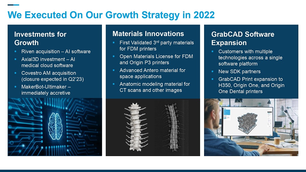 We Executed On Our Growth Strategy in 2022 Investments for Growth ▪ Riven acquisition – AI software ▪ Axial3D investment – AI medical cloud software ▪ Covestro AM acquisition (closure expected in Q2’23) ▪ MakerBot - Ultimaker – immediately accretive Materials Innovations ▪ First Validated 3 rd party materials for FDM printers ▪ Open Materials License for FDM and Origin P3 printers ▪ Advanced Antero material for space applications ▪ Anatomic modeling material for CT scans and other images GrabCAD Software Expansion ▪ Customers with multiple technologies across a single software platform ▪ New SDK partners ▪ GrabCAD Print expansion to H350, Origin One, and Origin One Dental printers