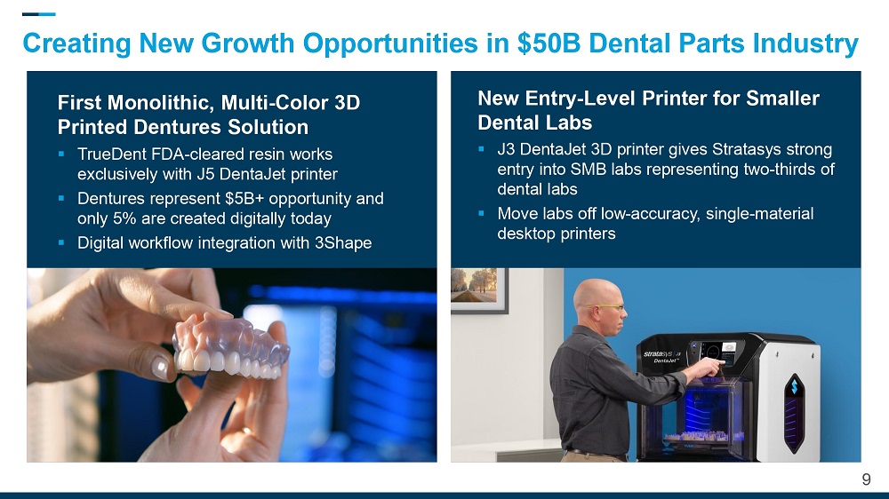 9 Creating New Growth Opportunities in $50B Dental Parts Industry First Monolithic, Multi - Color 3D Printed Dentures Solution ▪ TrueDent FDA - cleared resin works exclusively with J5 DentaJet printer ▪ Dentures represent $5B+ opportunity and only 5% are created digitally today ▪ Digital workflow integration with 3Shape New Entry - Level Printer for Smaller Dental Labs ▪ J3 DentaJet 3D printer gives Stratasys strong entry into SMB labs representing two - thirds of dental labs ▪ Move labs off low - accuracy, single - material desktop printers