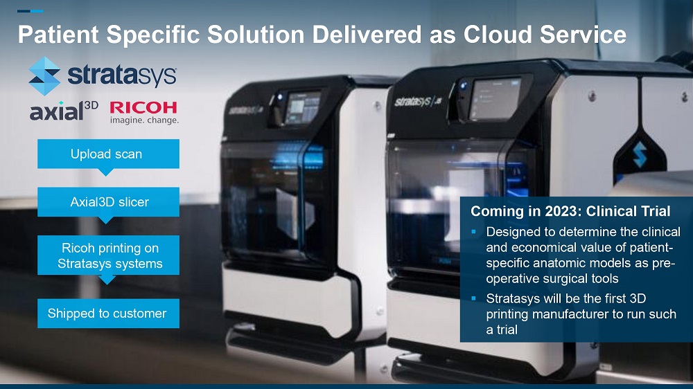 Coming in 2023: Clinical Trial ▪ Designed to determine the clinical and economical value of patient - specific anatomic models as pre - operative surgical tools ▪ Stratasys will be the first 3D printing manufacturer to run such a trial Patient Specific Solution Delivered as Cloud Service Shipped to customer Axial3D slicer Upload scan Ricoh printing on Stratasys systems