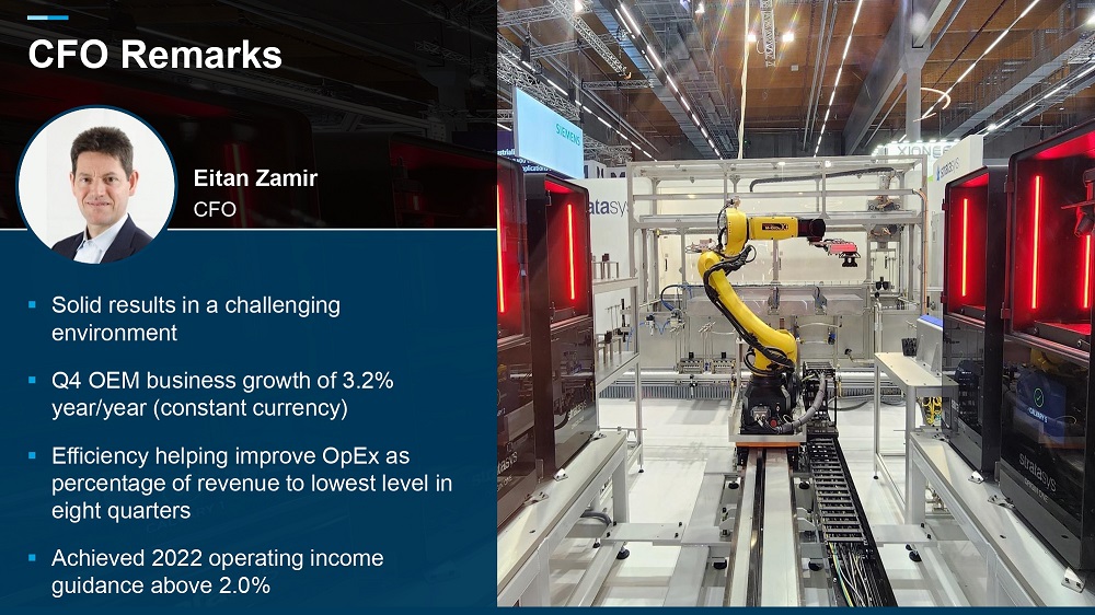 ▪ Solid results in a challenging environment ▪ Q4 OEM business growth of 3.2% year/year (constant currency) ▪ Efficiency helping improve OpEx as percentage of revenue to lowest level in eight quarters ▪ Achieved 2022 operating income guidance above 2.0% CFO Eitan Zamir CFO Remarks
