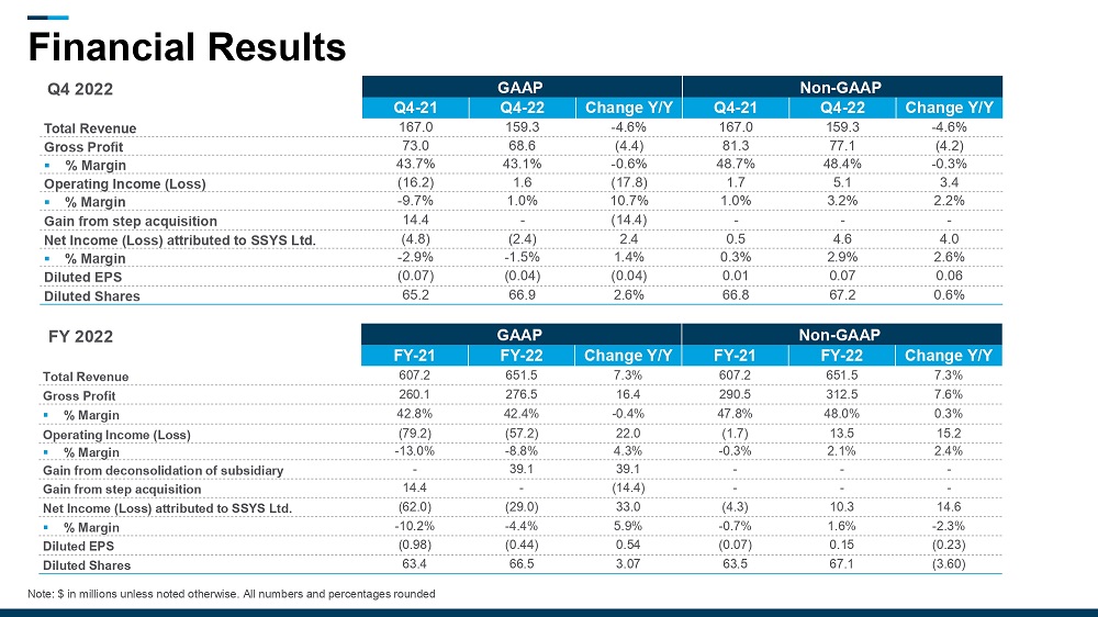 Financial Results Note: $ in millions unless noted otherwise. All numbers and percentages rounded GAAP Non - GAAP Q4 - 21 Q4 - 22 Change Y/Y Q4 - 21 Q - 22 Change Y/Y Total Revenue 167.0 159 3 - 4.6% 167.0 159.3 - 4.6% Gross Profit 73.0 68 . 6 (4 . 4) 81.3 77.1 (4.2) ▪ % Margin 43.7% 4 .1 % - 0 . 6% 48.7% 48.4% - 0 . 3% Operating Income (Loss) (16.2) 1.6 (17 . 8) 1.7 5.1 3.4 ▪ % Margin - 9.7% 1.0% 10 . 7% 1.0% 3.2% 2.2% Gain from step acquisition 14.4 - (14.4) - - - Net Income (Loss) attributed to SSYS Ltd. (4.8) (2.4) 2.4 0.5 4.6 4.0 ▪ % Margin - 2.9% - 1.5% 1.4% 0.3% 2.9% 2.6% Diluted EPS (0.07) (0.04) (0.04) 0.01 0.07 0.06 Diluted Shares 6 5 . 2 6 6 . 9 2.6% 66.8 67.2 0.6% GAAP Non - GAAP FY - 21 FY - 22 Change Y/Y FY - 21 FY - 22 Change Y/Y Total Revenue 607.2 651 5 7.3% 607.2 651.5 7.3% Gross Profit 260.1 76 . 5 16 . 4 290.5 312.5 7 . 6% ▪ % Margin 42.8% 4 .4 % - 0 . 4% 47.8% 48.0% 0 . 3% Operating Income (Loss) (79.2) (57.2) 22.0 (1.7) 13.5 15.2 ▪ % Margin - 13.0% - 8.8% 4 . 3% - 0.3% 2.1% 2.4% Gain from deconsolidation of subsidiary - 39.1 39.1 - - - Gain from step acquisition 14.4 - (14.4) - - - Net Income (Loss) attributed to SSYS Ltd. (62.0) (29.0) 33.0 (4.3) 10.3 14.6 ▪ % Margin - 10.2% - % % - 0.7% 1.6% - 2.3% Diluted EPS (0.98) (0.44) 0.54 (0.07) 0.15 (0.23) Diluted Shares 63.4 6 6 . 5 3.07 63.5 67.1 (3.60) Q 4 2022 FY 2022