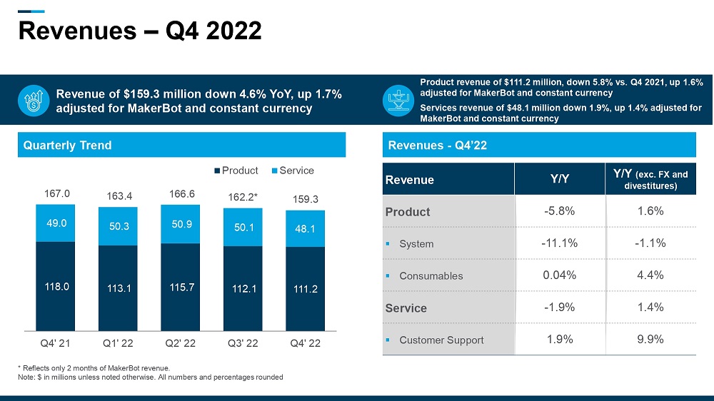 Revenues – Q4 2022 * Reflects only 2 months of MakerBot revenue. Note: $ in millions unless noted otherwise. All numbers and percentages rounded Quarterly Trend Revenues - Q4’22 118.0 113.1 115.7 112.1 111.2 49.0 50.3 50.9 50.1 48.1 167.0 163.4 166.6 162.2* 159.3 Q4' 21 Q1' 22 Q2' 22 Q3' 22 Q4' 22 Product Service Revenue Y/Y Y/Y (exc. FX and divestitures) Product - 5 . 8 % 1 . 6 % ▪ System - 11 . 1 % - 1 . 1 % ▪ Consumables 0.04% .4 % Service - 1.9% . % ▪ Customer Support 1.9% . % Revenue of $159.3 million down 4.6 % YoY, up 1.7% adjusted for MakerBot and constant currency Product revenue of $ 111.2 million, down 5.8 % vs. Q 4 2021 , up 1.6 % adjusted for MakerBot and constant currency S ervices revenue of $ 48.1 million down 1.9 %, up 1.4 % adjusted for MakerBot and constant currency
