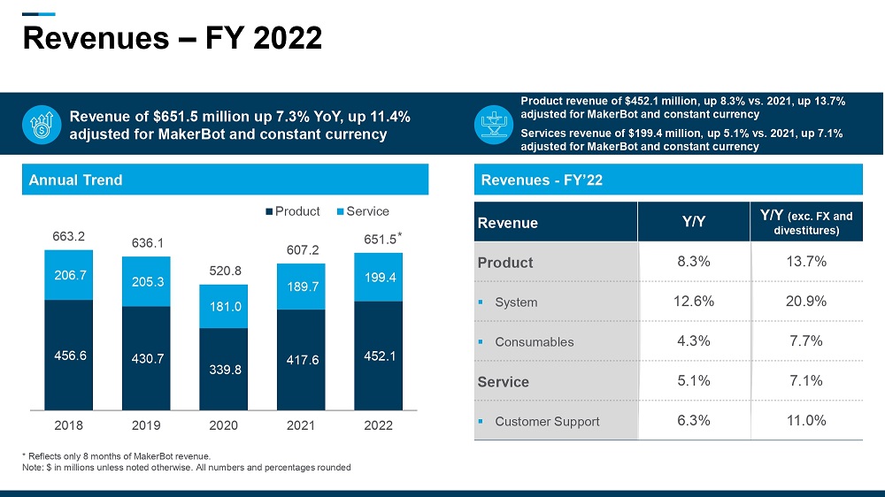Revenues – FY 2022 * Reflects only 8 months of MakerBot revenue. Note: $ in millions unless noted otherwise. All numbers and percentages rounded Annual Trend 456.6 430.7 339.8 417.6 452.1 206.7 205.3 181.0 189.7 199.4 663.2 636.1 520.8 607.2 651.5 2018 2019 2020 2021 2022 Product Service Revenue of $651.5 million up 7 .3 % YoY, up 11.4% adjusted for MakerBot and constant currency Product revenue of $452.1 million, up 8.3% vs. 2021, up 13.7% adjusted for MakerBot and constant currency S ervices revenue of $199.4 million, up 5 .1 % vs. 2021, up 7 .1 % adjusted for MakerBot and constant currency * Revenues - FY’22 Revenue Y/Y Y/Y (exc. FX and divestitures) Product 8.3 % 13 . 7 % ▪ System 12 . 6 % 20 . 9 % ▪ Consumables 4.3% 7.7% Service 5.1% 7.1% ▪ Customer Support 6.3% 11 . 0 %