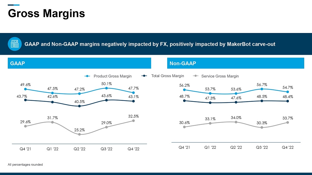 Gross Margins GAAP Non - GAAP 43.7% 42.6% 40.5% 43.6% 43.1% 49.6% 47.5% 47.2 % 50.1% 47.7% 29.6% 31.7% 25.2% 29.0% 32.5% Q4 '21 Q1 '22 Q2 '22 Q3 '22 Q4 '22 48.7 % 47.3% 47.6% 48.5% 48.4% 56.2% 53.7% 53.6% 56.7 % 54.7% 30.6% 33.1% 34.0% 30.3% 33.7% Q4 '21 Q1 '22 Q2 '22 Q3 '22 Q4 '22 Service Gross Margin Product Gross Margin Total Gross Margin All percentages rounded GAAP and Non - GAAP margins negatively impacted by FX, positively impacted by MakerBot carve - out