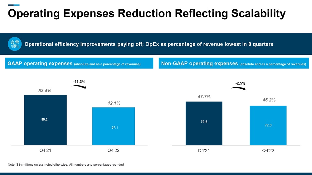 Operating Expenses Reduction Reflecting Scalability GAAP operating expenses (absolute and as a percentage of revenues) Non - GAAP operating expenses (absolute and as a percentage of revenues) Operational efficiency improvements paying off; OpEx as percentage of revenue lowest in 8 quarters 89.2 67.1 Q4'21 Q4'22 42.1% - 11.3% 79.6 72.0 Q4'21 Q4'22 45.2% - 2.5% Note: $ in millions unless noted otherwise. All numbers and percentages rounded 53.4% 47.7%