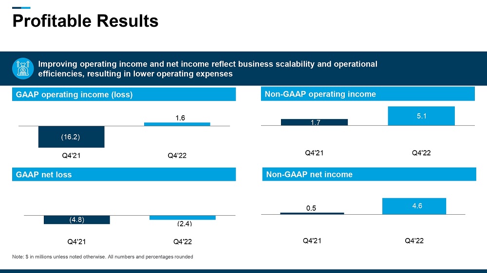 Profitable Results Note: $ in millions unless noted otherwise. All numbers and percentages rounded GAAP operating income (loss) Non - GAAP operating income Improving operating income and net income reflect business scalability and operational efficiencies, resulting in lower operating expenses GAAP net loss Non - GAAP net income 1.7 5.1 Q4'21 Q4'22 ( 16.2 ) 1.6 Q4'21 Q4'22 0.5 4.6 Q4'21 Q4'22 (4.8) (2.4) Q4'21 Q4'22