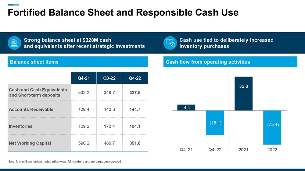 Fortified Balance Sheet and Responsible Cash Use Note: $ in millions unless noted otherwise. All numbers and percentages rounded Strong balance sheet at $328M cash and equivalents after recent strategic investments Cash use tied to deliberately increased inventory purchases Balance sheet items Cash flow from operating activities Q 4 - 21 Q3 - 22 Q4 - 22 Cash and Cash Equivalents and Short - term deposits 502.2 348 7 327.8 Accounts Receivable 129.4 40 144.7 Inventories 129.2 170 4 194.1 Net Working Capital 590.2 480.7 351.8 4.4 (18.1) 35.8 Q4' 21 Q4' 22 2021 2022 (75.4)