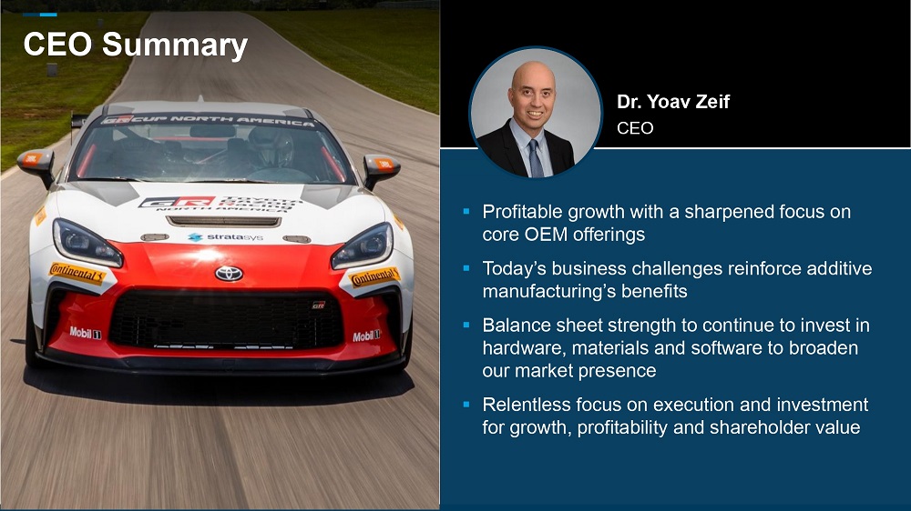 ▪ Profitable growth with a sharpened focus on core OEM offerings ▪ Today’s business challenges reinforce additive manufacturing’s benefits ▪ Balance sheet strength to continue to invest in hardware, materials and software to broaden our market presence ▪ Relentless focus on execution and investment for growth, profitability and shareholder value CEO Summary CEO Dr. Yoav Zeif