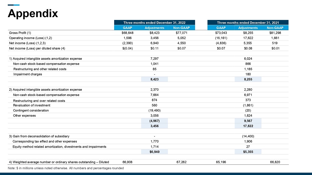 Appendix Note: $ in millions unless noted otherwise. All numbers and percentages rounded Three months ended December 31 , 2022 Three months ended December 31, 2021 GAAP Adjustments Non - GAAP GAAP Adjustments Non - GAAP Gross Profit (1) $ 68,648 $ 8,423 $ , $ 73,043 $ 8,255 $ 81,298 Operating income (Loss) (1,2) 1,596 3,456 5,052 ( , 61 ) , 22 1,661 Net income (Loss) (1,2,3) ( 2,390 ) 6,940 4,550 ( 4,836 ) 5,355 9 Net income (Loss) per diluted share ( 4) ) $ 11 $ 0.07 $ 0.08 1) Acquired intangible assets amortization expense 7,297 6,024 Non - cash stock - based compensation expense 1,041 866 Restructuring and other related costs 85 1,185 Impairment charges 180 8 423 8,255 2) Acquired intangible assets amortization expense 2,370 2,280 Non - cash stock - based compensation expense 7,664 6,971 Restructuring and over related costs 874 373 Revaluation of investment 560 (1,861) Contingent consideration (19,490) (20) Other expenses 3,056 1,824 (4,967) 9,567 3,456 17,822 3) Gain from deconsolidation of subsidiary - (14,400) Corresponding tax effect and other expenses 1,770 1,906 Equity method related amortization, divestments and impairments 1,714 27 $6,940 $5,355 4) Weighted average number or ordinary shares outstanding – Diluted 66,908 67,262 65,196 66,820