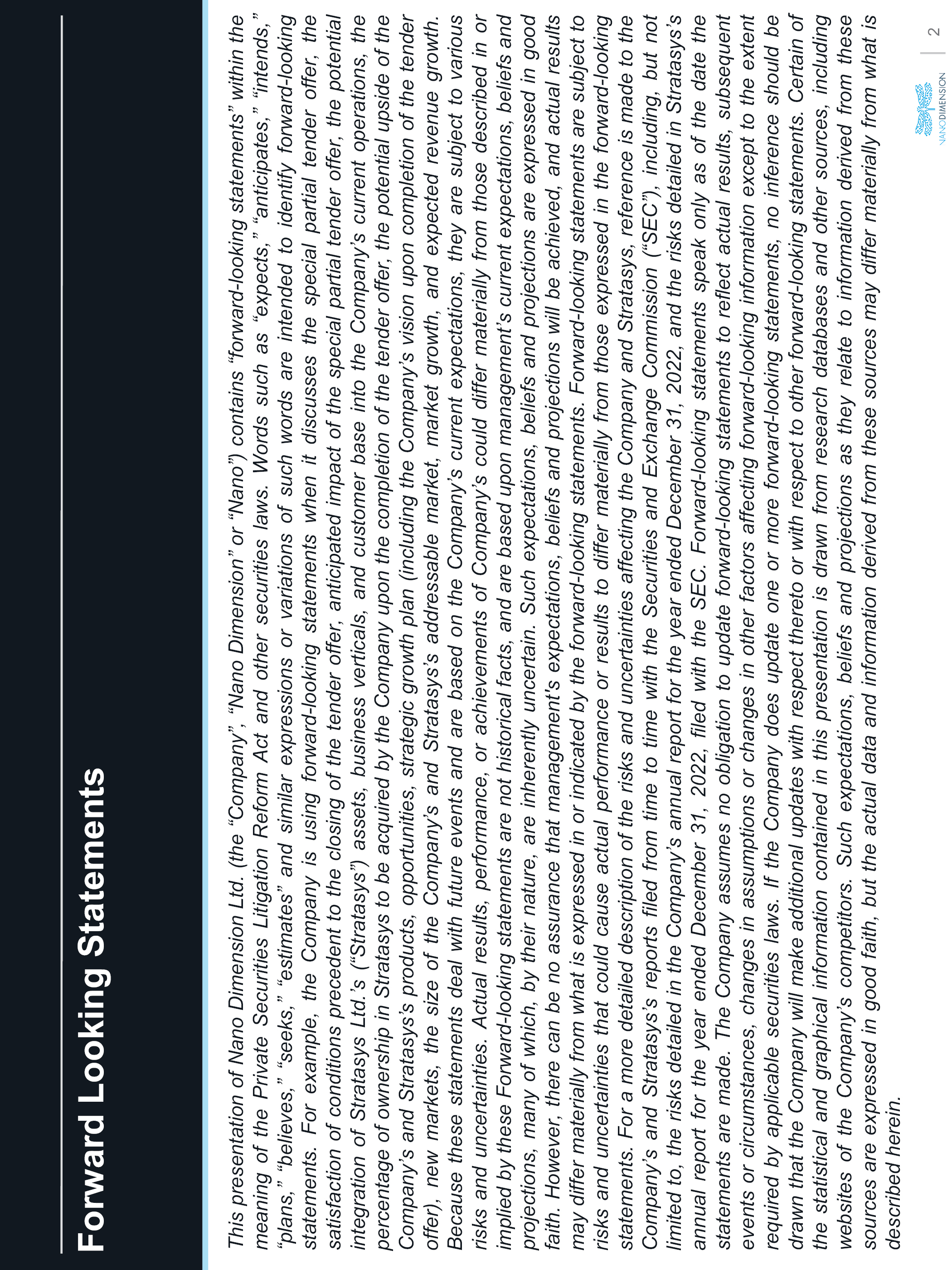 Forward Looking Statements ThispresentationofNanoDimensionLtd.(the“Company”,“NanoDimension”or“Nano”)contains“forward-lookingstatements”withinthemeaningofthePrivateSecuritiesLitigationReformActandothersecuritieslaws.Wordssuchas“expects,”“anticipates,”“intends,”“plans,”“believes,”“seeks,”“estimates”andsimilarexpressionsorvariationsofsuchwordsareintendedtoidentifyforward-lookingstatements.Forexample,theCompanyisusingforward-lookingstatementswhenitdiscussesthespecialpartialtenderoffer,thesatisfactionofconditionsprecedenttotheclosingofthetenderoffer,anticipatedimpactofthespecialpartialtenderoffer,thepotentialintegrationofStratasysLtd.’s(“Stratasys”)assets,businessverticals,andcustomerbaseintotheCompany’scurrentoperations,thepercentageofownershipinStratasystobeacquiredbytheCompanyuponthecompletionofthetenderoffer,thepotentialupsideoftheCompany’sandStratasys’sproducts,opportunities,strategicgrowthplan(includingtheCompany’svisionuponcompletionofthetenderoffer),newmarkets,thesizeoftheCompany’sandStratasys’saddressablemarket,marketgrowth,andexpectedrevenuegrowth.BecausethesestatementsdealwithfutureeventsandarebasedontheCompany’scurrentexpectations,theyaresubjecttovariousrisksanduncertainties.Actualresults,performance,orachievementsofCompany’scoulddiffermateriallyfromthosedescribedinorimpliedbytheseForward-lookingstatementsarenothistoricalfacts,andarebaseduponmanagement’scurrentexpectations,beliefsandprojections,manyofwhich,bytheirnature,areinherentlyuncertain.Suchexpectations,beliefsandprojectionsareexpressedingoodfaith.However,therecanbenoassurancethatmanagement’sexpectations,beliefsandprojectionswillbeachieved,andactualresultsmaydiffermateriallyfromwhatisexpressedinorindicatedbytheforward-lookingstatements.Forward-lookingstatementsaresubjecttorisksanduncertaintiesthatcouldcauseactualperformanceorresultstodiffermateriallyfromthoseexpressedintheforward-lookingstatements.ForamoredetaileddescriptionoftherisksanduncertaintiesaffectingtheCompanyandStratasys,referenceismadetotheCompany’sandStratasys’sreportsfiledfromtimetotimewiththeSecuritiesandExchangeCommission(“SEC”),including,butnotlimitedto,therisksdetailedintheCompany’sannualreportfortheyearendedDecember31,2022,andtherisksdetailedinStratasys’sannualreportfortheyearendedDecember31,2022,filedwiththeSEC.Forward-lookingstatementsspeakonlyasofthedatethestatementsaremade.TheCompanyassumesnoobligationtoupdateforward-lookingstatementstoreflectactualresults,subsequenteventsorcircumstances,changesinassumptionsorchangesinotherfactorsaffectingforward-lookinginformationexcepttotheextentrequiredbyapplicablesecuritieslaws.IftheCompanydoesupdateoneormoreforward-lookingstatements,noinferenceshouldbedrawnthattheCompanywillmakeadditionalupdateswithrespecttheretoorwithrespecttootherforward-lookingstatements.Certainofthestatisticalandgraphicalinformationcontainedinthispresentationisdrawnfromresearchdatabasesandothersources,includingwebsitesoftheCompany’scompetitors.Suchexpectations,beliefsandprojectionsastheyrelatetoinformationderivedfromthesesourcesareexpressedingoodfaith,buttheactualdataandinformationderivedfromthesesourcesmaydiffermateriallyfromwhatisdescribedherein.