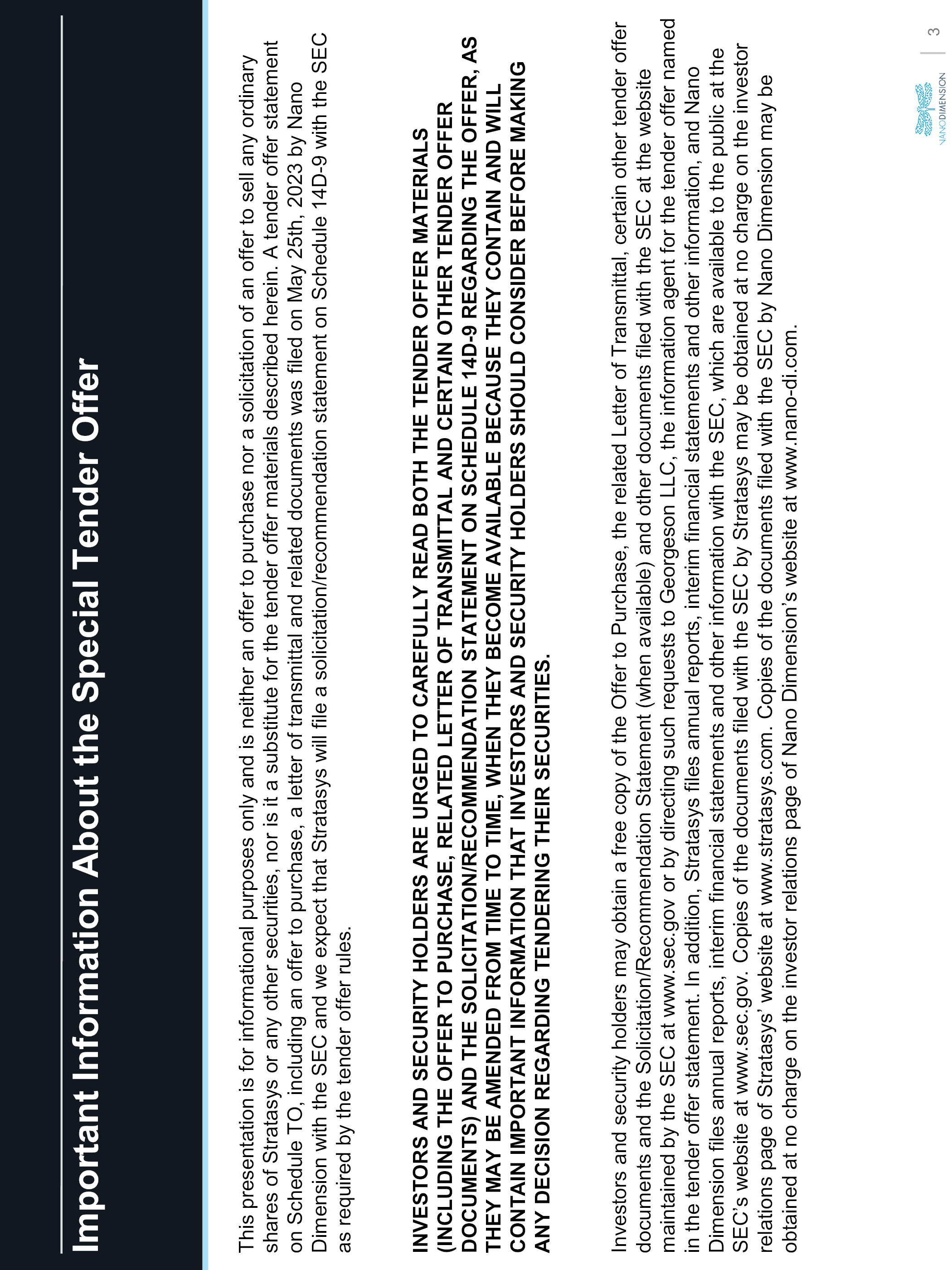 Important Information About the Special Tender Offer This presentation is for informational purposes only and is neither an offer to purchase nor a solicitation of an offer to sell any ordinary shares of Stratasys or any other securities, nor is it a substitute for the tender offer materials described herein. A tenderoffer statement on Schedule TO, including an offer to purchase, a letter of transmittal and related documents was filed on May 25th, 2023by Nano Dimension with the SEC and we expect that Stratasys will file a solicitation/recommendation statement on Schedule 14D-9 with theSEC as required by the tender offer rules. INVESTORS AND SECURITY HOLDERS ARE URGED TO CAREFULLY READ BOTH THE TENDER OFFER MATERIALS (INCLUDING THE OFFER TO PURCHASE, RELATED LETTER OF TRANSMITTAL AND CERTAIN OTHER TENDER OFFER DOCUMENTS) AND THE SOLICITATION/RECOMMENDATION STATEMENT ON SCHEDULE 14D-9 REGARDING THE OFFER, AS THEY MAY BE AMENDED FROM TIME TO TIME, WHEN THEY BECOME AVAILABLE BECAUSE THEY CONTAIN AND WILL CONTAIN IMPORTANT INFORMATION THAT INVESTORS AND SECURITY HOLDERS SHOULD CONSIDER BEFORE MAKING ANY DECISION REGARDING TENDERING THEIR SECURITIES. Investors and security holders may obtain a free copy of the Offer to Purchase, the related Letter of Transmittal, certain othertender offer documents and the Solicitation/Recommendation Statement (when available) and other documents filed with the SEC at the website maintained by the SEC at www.sec.gov or by directing such requests to GeorgesonLLC, the information agent for the tender offer named in the tender offer statement. In addition, Stratasys files annual reports, interim financial statements and other information, and Nano Dimension files annual reports, interim financial statements and other information with the SEC, which are available to the public at the SEC’s website at www.sec.gov. Copies of the documents filed with the SEC by Stratasys may be obtained at no charge on the investor relations page of Stratasys’ website at www.stratasys.com. Copies of the documents filed with the SEC by Nano Dimension may be obtained at no charge on the investor relations page of Nano Dimension’s website at www.nano-di.com.