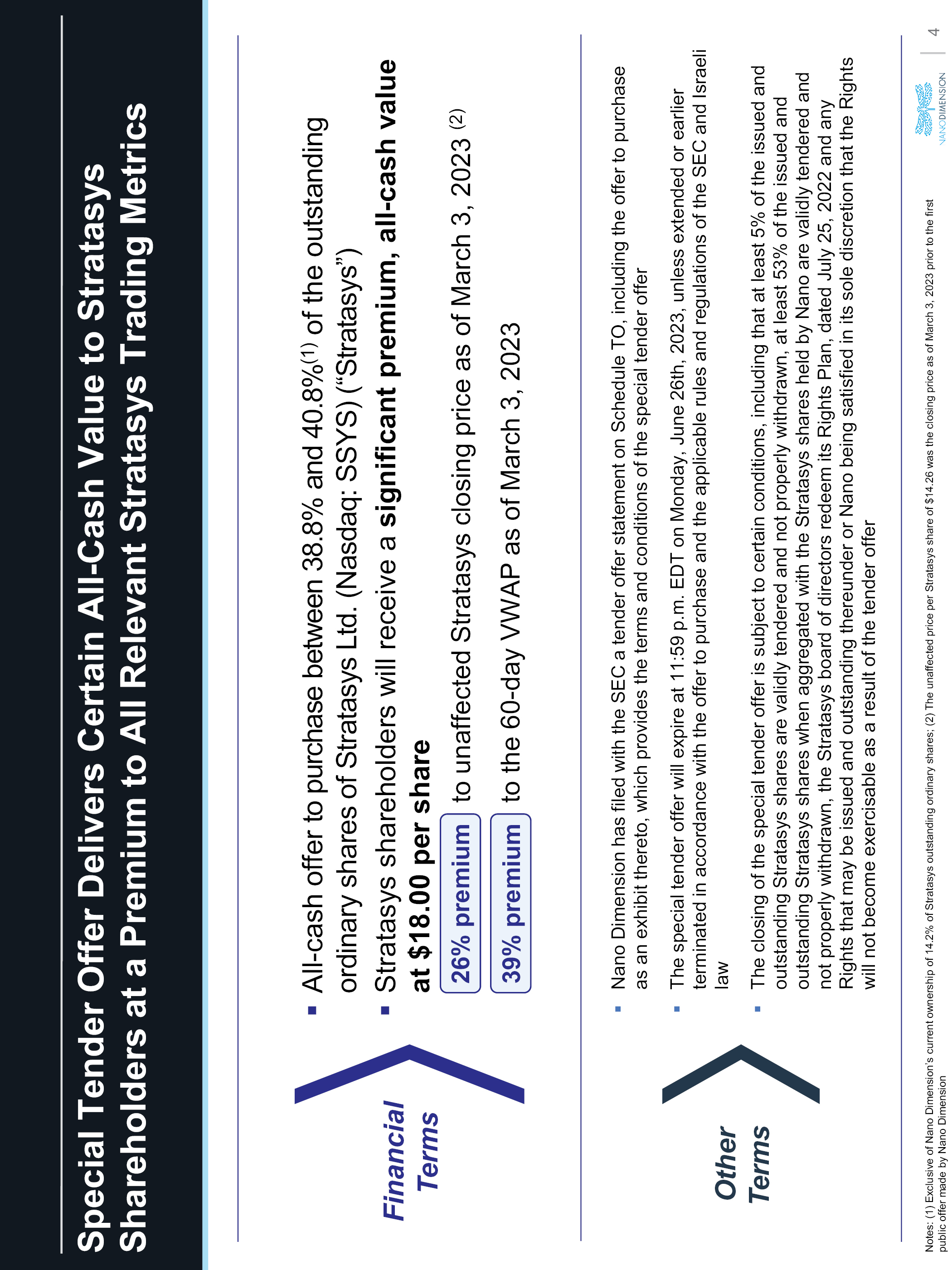 Special Tender Offer Delivers Certain All-Cash Value to Stratasys Shareholders at a Premium to All Relevant Stratasys Trading Metrics All-cashofferto purchase between 38.8% and 40.8%(1)oftheoutstanding ordinary shares of Stratasys Ltd. (Nasdaq: SSYS) (“Stratasys”) Stratasys shareholders will receive a significant premium, all-cash value at $18.00 per share 26% premium tounaffected Stratasys closingprice as of March 3, 2023 (2) 39% premium to the 60-day VWAP as of March 3, 2023 Financial Terms Other Terms Nano Dimensionhas filed with the SEC a tender offer statement on Schedule TO, including the offer to purchase as an exhibit thereto, which provides the terms and conditions of the special tender offer The special tender offer will expire at 11:59 p.m. EDT on Monday, June 26th, 2023, unless extended or earlier terminated in accordance with the offer to purchase and the applicable rules and regulations of the SEC and Israeli law The closing of the special tender offer is subject to certain conditions, including that at least 5% of the issued and outstanding Stratasys shares are validly tendered and not properly withdrawn, at least 53% of the issued and outstanding Stratasys shares when aggregated with the Stratasys shares held by Nano are validly tendered and not properly withdrawn, the Stratasys board of directors redeem its Rights Plan, dated July 25, 2022 and any Rights that may be issued and outstanding thereunder or Nano being satisfied in its sole discretion that the Rights will not become exercisable as a result of the tender offer Notes: (1) Exclusive of Nano Dimension’s current ownership of 14.2% of Stratasys outstanding ordinary shares; (2) The unaffected price per Stratasys share of $14.26 was the closing price as of March 3, 2023 prior to the first public offer made by Nano Dimension