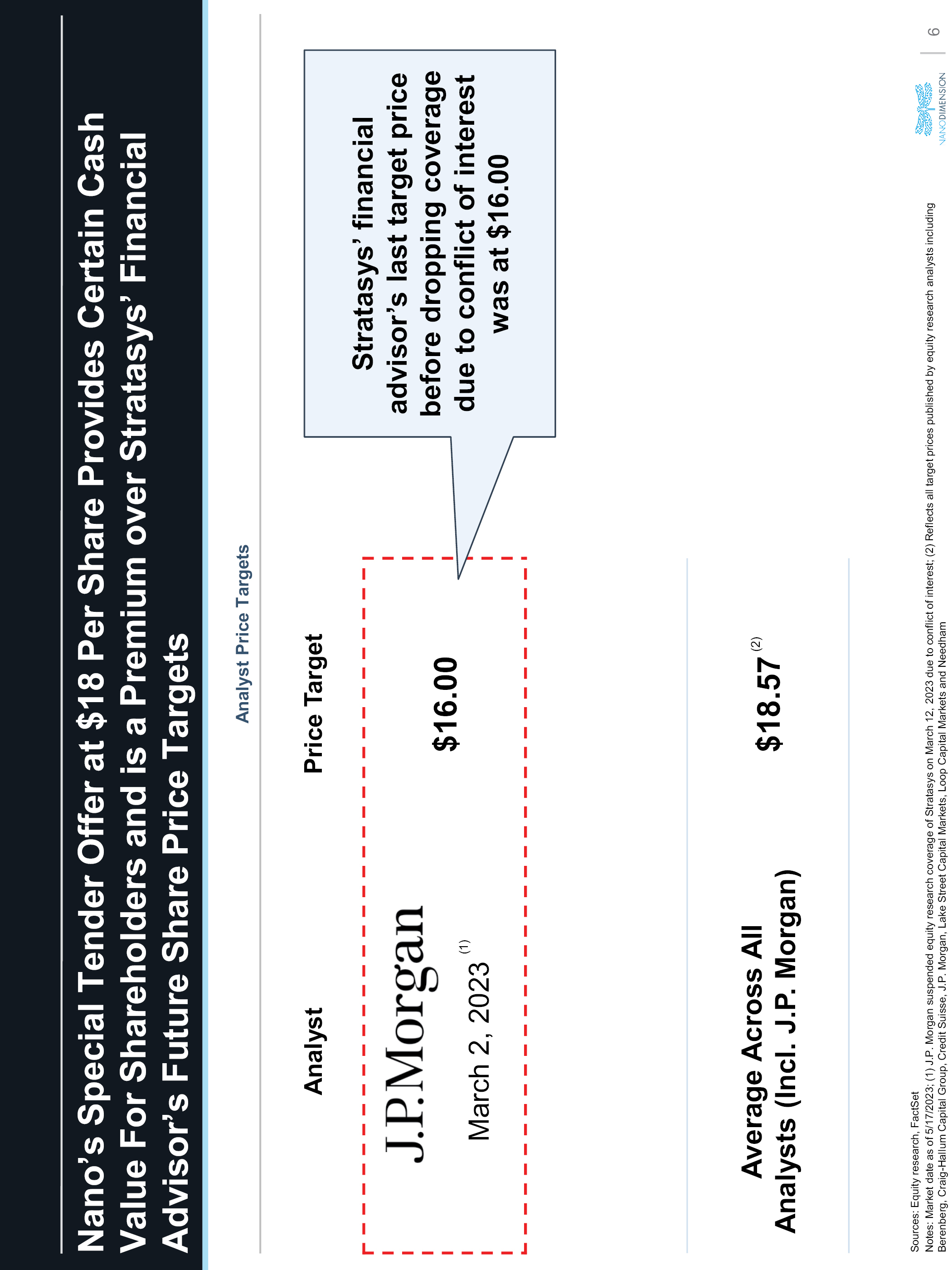 Nano’s Special Tender Offer at $18 Per Share Provides Certain Cash Value For Shareholders and is a Premium over Stratasys’ Financial Advisor’s Future Share Price Targets Analyst Price Targets Price Target J.P. Morgan Nano’s Special Tender Offer at $18 Per Share Provides Certain Cash Value For Shareholders and is a Premium over Stratasys’ Financial Advisor’s Future Share Price TargetsMarch 2, 2023 $16.00 Average Across All Analysts (Incl. J.P. Morgan) $18.57 Stratasys’ financial advisor’s last target price before dropping coverage due to conflict of interest was at $16.00