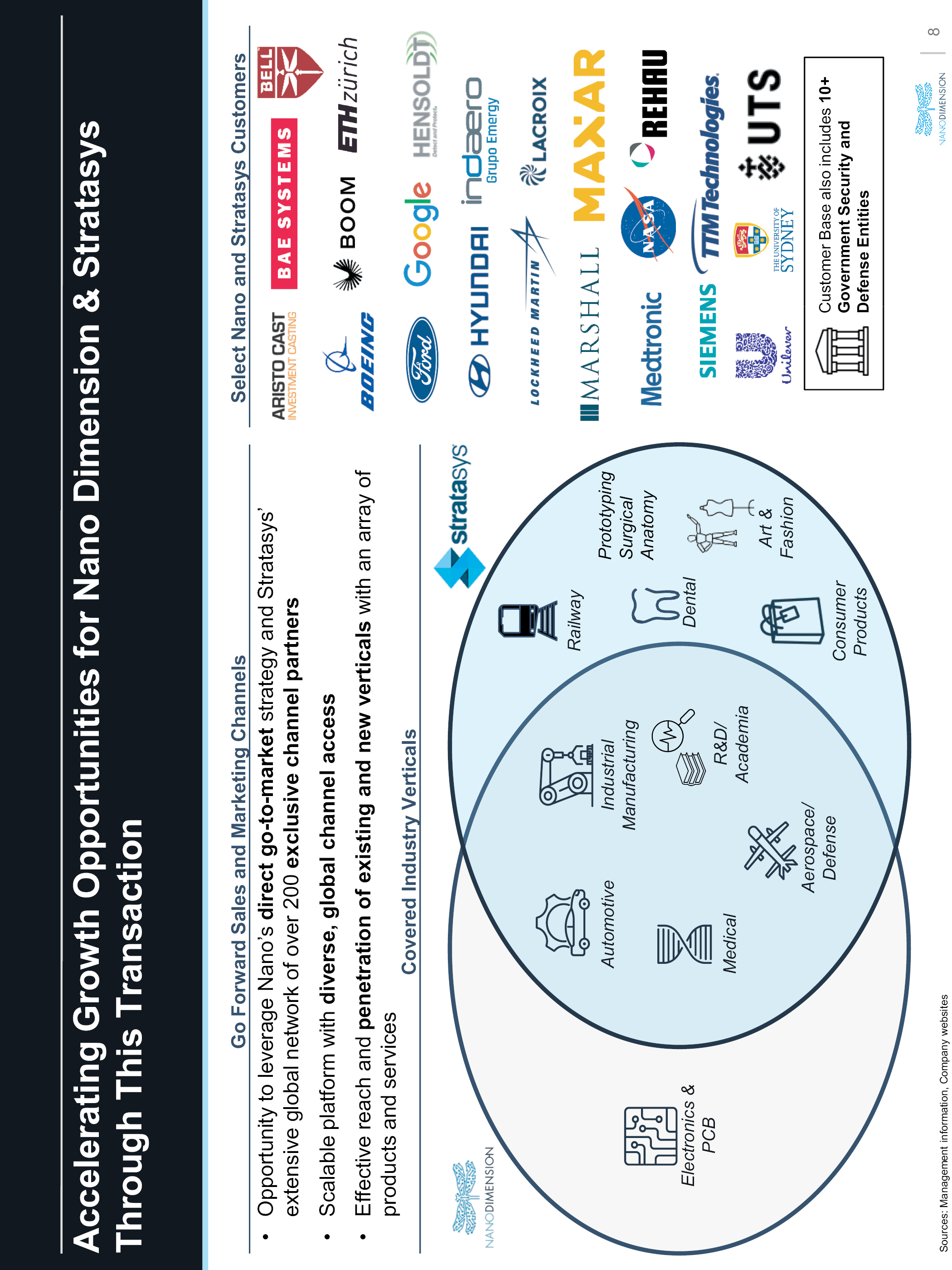 Accelerating Growth Opportunities for Nano Dimension & Stratasys Through This Transaction Go Forward Sales and Marketing Channels Select Nano and Stratasys Customers Opportunity to leverage Nano’s direct go-to-market strategy and Stratasys’ extensive global network of over 200 exclusive channel partners Scalable platform with diverse, global channel access Effective reach and penetration of existing and new verticals with an array of products and services Covered Industry Verticals Industrial Manufacturing Electronics & PCB R&D/ Academia Medical Automotive Aerospace/ Defense Consumer Products Railway Dental Art & Fashion Prototyping Surgical Anatomy Customer Base also includes 10 Government Security and Defense Entities